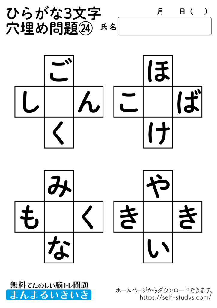 ひらがな穴埋め問題プリント24 2022.07.11 ひらがな穴埋め問題プリント24問題はすべて無料で使えます。下記の画像、もしくは、【問題ダウンロード】をクリックして印刷してご利用ください。 問題ダウンロード答えダウンロード 意外と出てこないひらがなの穴埋め問題。あれもこれもとたくさんの単語を頭に浮かべるので、思考力が向上し脳の活性化につながります。いつまでも健康でいられるお手伝いが出来たら幸せです。