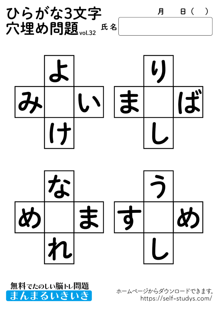 ひらがな穴埋め問題プリント32 2022.07.11 ひらがな穴埋め問題プリント32問題はすべて無料で使えます。下記の画像、もしくは、【問題ダウンロード】をクリックして印刷してご利用ください。 問題ダウンロード答えダウンロード 意外と出てこないひらがなの穴埋め問題。あれもこれもとたくさんの単語を頭に浮かべるので、思考力が向上し脳の活性化につながります。いつまでも健康でいられるお手伝いが出来たら幸せです。