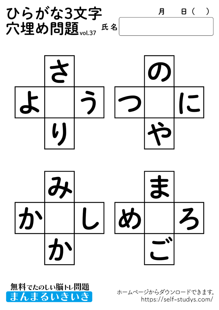 ひらがな穴埋め問題プリント37 2022.07.11 ひらがな穴埋め問題プリント37問題はすべて無料で使えます。下記の画像、もしくは、【問題ダウンロード】をクリックして印刷してご利用ください。 問題ダウンロード答えダウンロード 意外と出てこないひらがなの穴埋め問題。あれもこれもとたくさんの単語を頭に浮かべるので、思考力が向上し脳の活性化につながります。いつまでも健康でいられるお手伝いが出来たら幸せです。