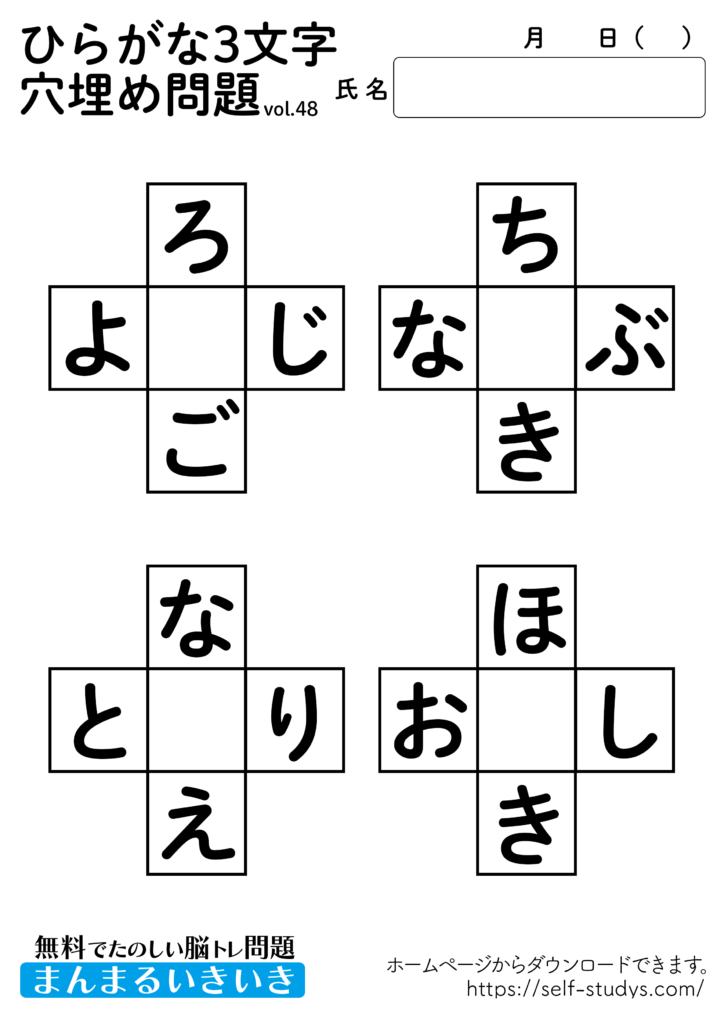 ひらがな穴埋め問題プリント48 2022.07.11 ひらがな穴埋め問題プリント48問題はすべて無料で使えます。下記の画像、もしくは、【問題ダウンロード】をクリックして印刷してご利用ください。 問題ダウンロード答えダウンロード 意外と出てこないひらがなの穴埋め問題。あれもこれもとたくさんの単語を頭に浮かべるので、思考力が向上し脳の活性化につながります。いつまでも健康でいられるお手伝いが出来たら幸せです。
