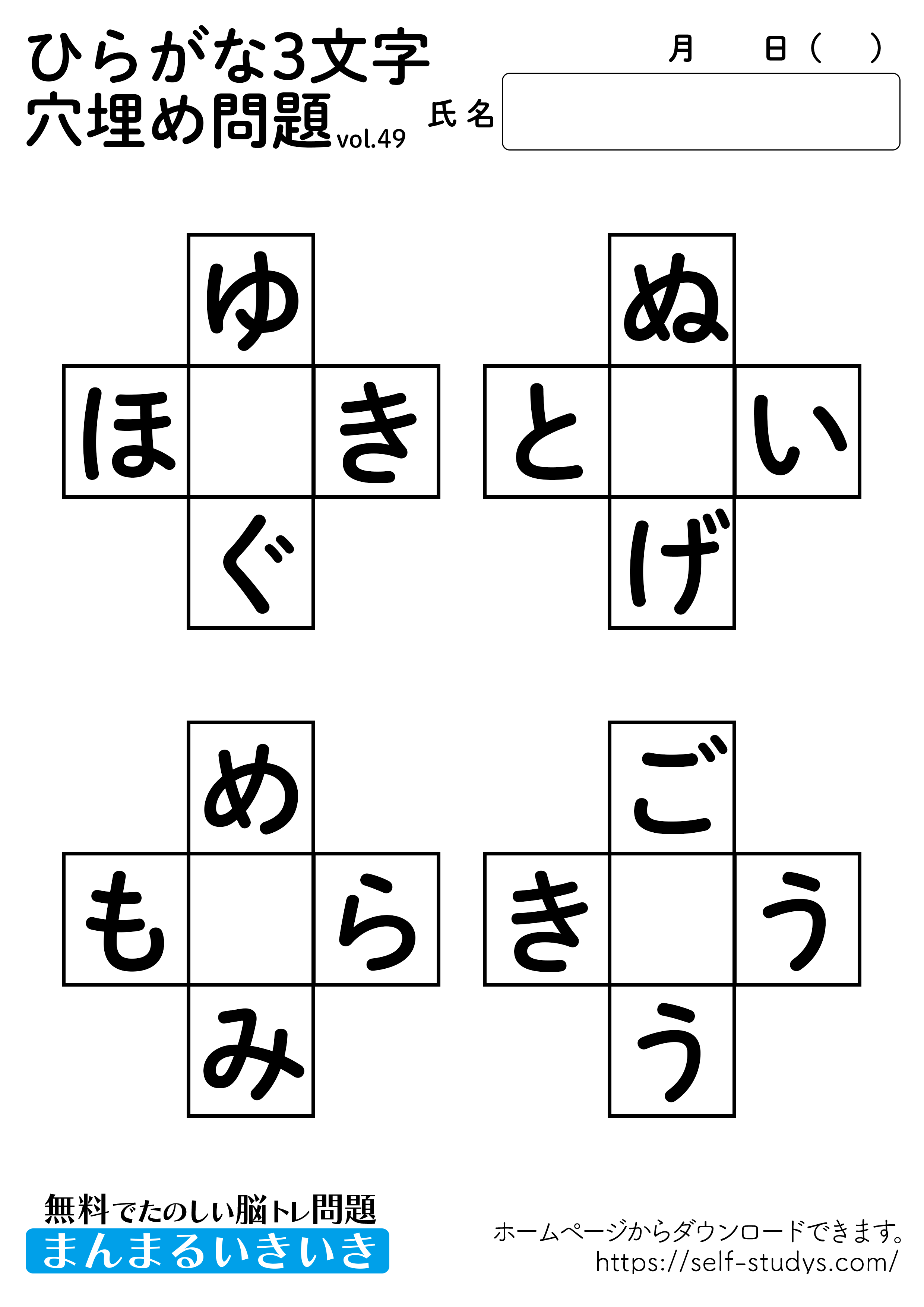 ひらがな穴埋め問題プリント49 2022.07.11 ひらがな穴埋め問題プリント49問題はすべて無料で使えます。下記の画像、もしくは、【問題ダウンロード】をクリックして印刷してご利用ください。 問題ダウンロード答えダウンロード 意外と出てこないひらがなの穴埋め問題。あれもこれもとたくさんの単語を頭に浮かべるので、思考力が向上し脳の活性化につながります。いつまでも健康でいられるお手伝いが出来たら幸せです。
