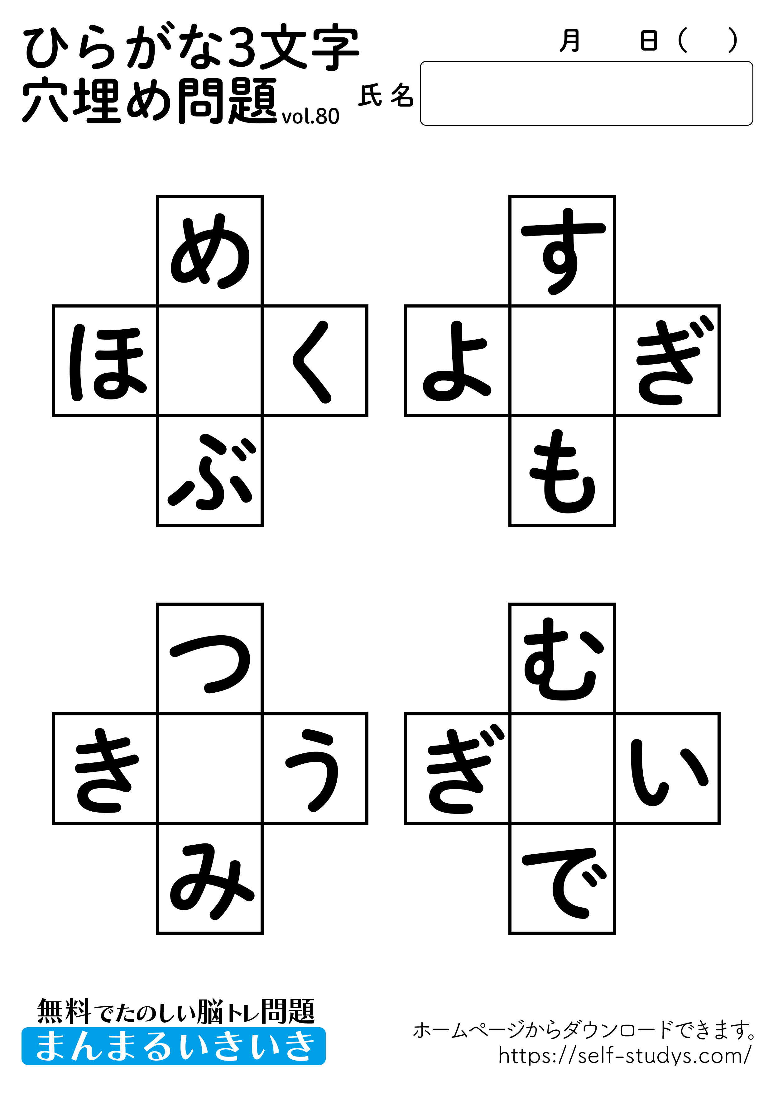 ひらがな穴埋め問題プリント80 2022.07.12 ひらがな穴埋め問題プリント問題はすべて無料で使えます。下記の画像、もしくは、【問題ダウンロード】をクリックして印刷してご利用ください。 問題ダウンロード答えダウンロード 意外と出てこないひらがなの穴埋め問題。あれもこれもとたくさんの単語を頭に浮かべるので、思考力が向上し脳の活性化につながります。いつまでも健康でいられるお手伝いが出来たら幸せです。