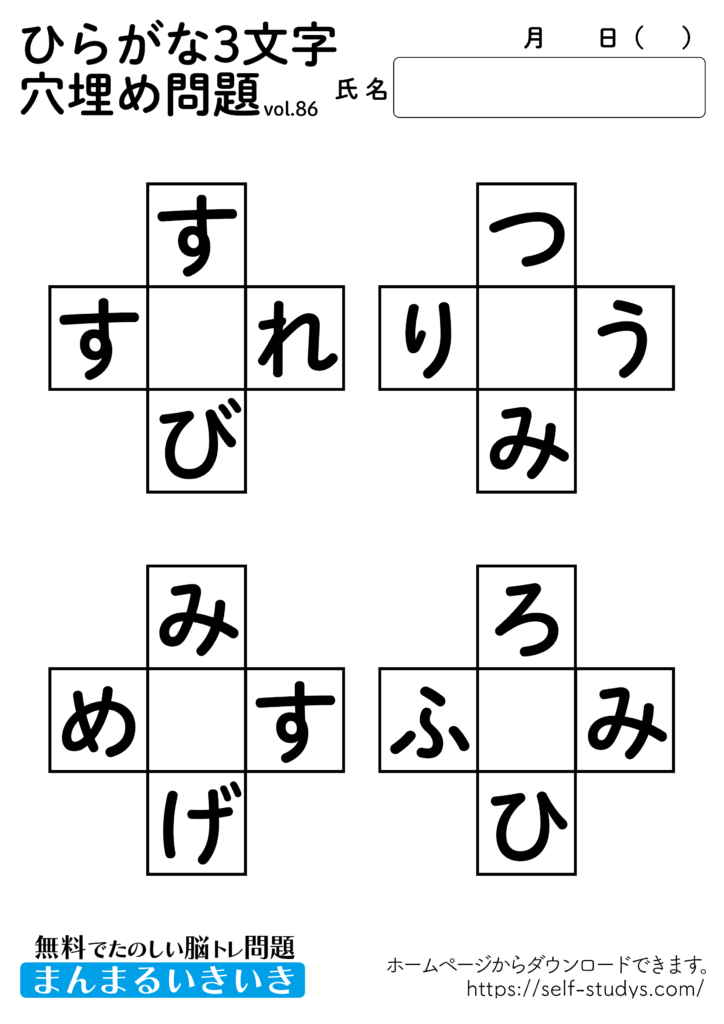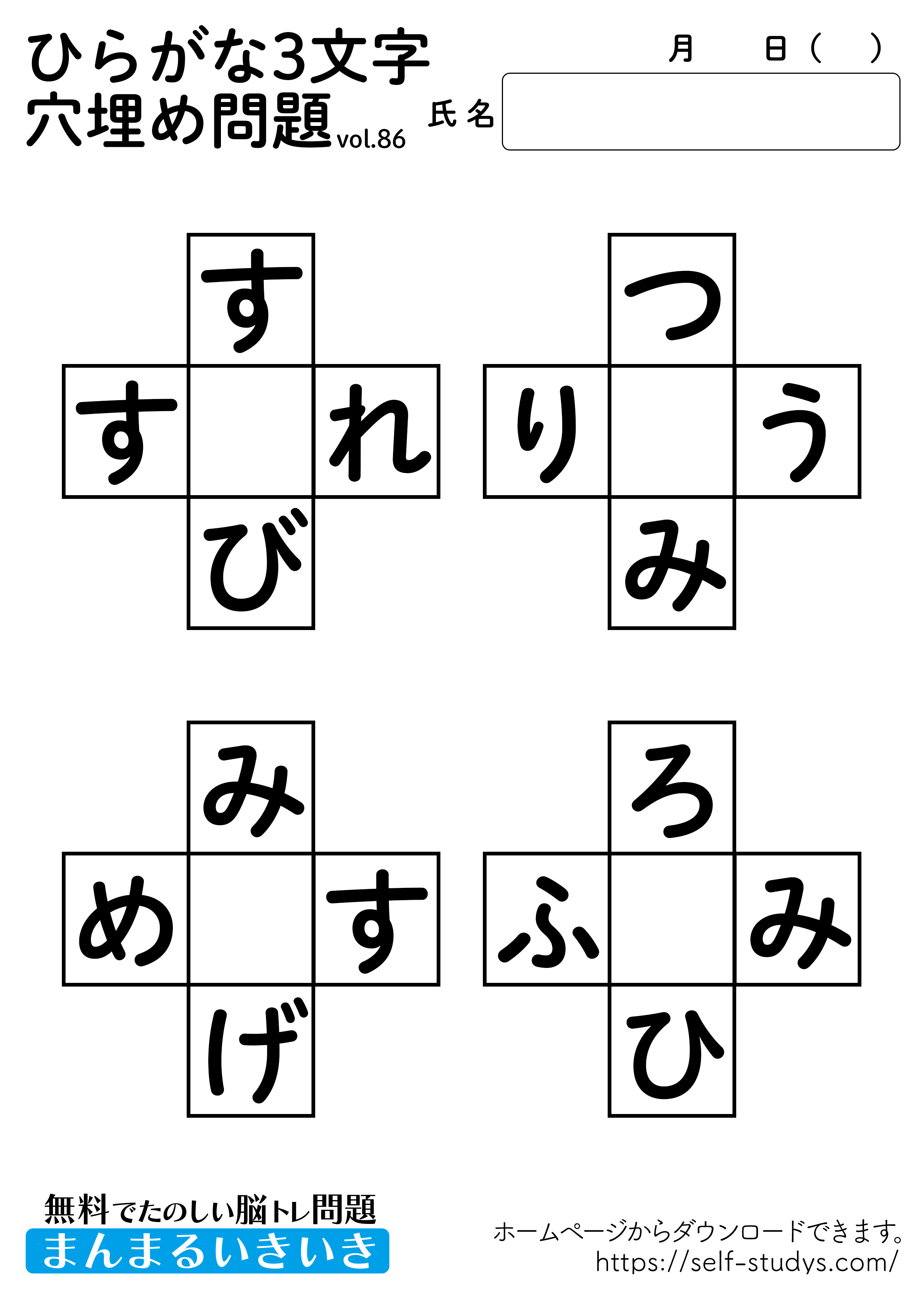ひらがな穴埋め問題プリント86 2022.07.13 ひらがな穴埋め問題プリント86問題はすべて無料で使えます。下記の画像、もしくは、【問題ダウンロード】をクリックして印刷してご利用ください。 問題ダウンロード答えダウンロード 意外と出てこないひらがなの穴埋め問題。あれもこれもとたくさんの単語を頭に浮かべるので、思考力が向上し脳の活性化につながります。いつまでも健康でいられるお手伝いが出来たら幸せです。
