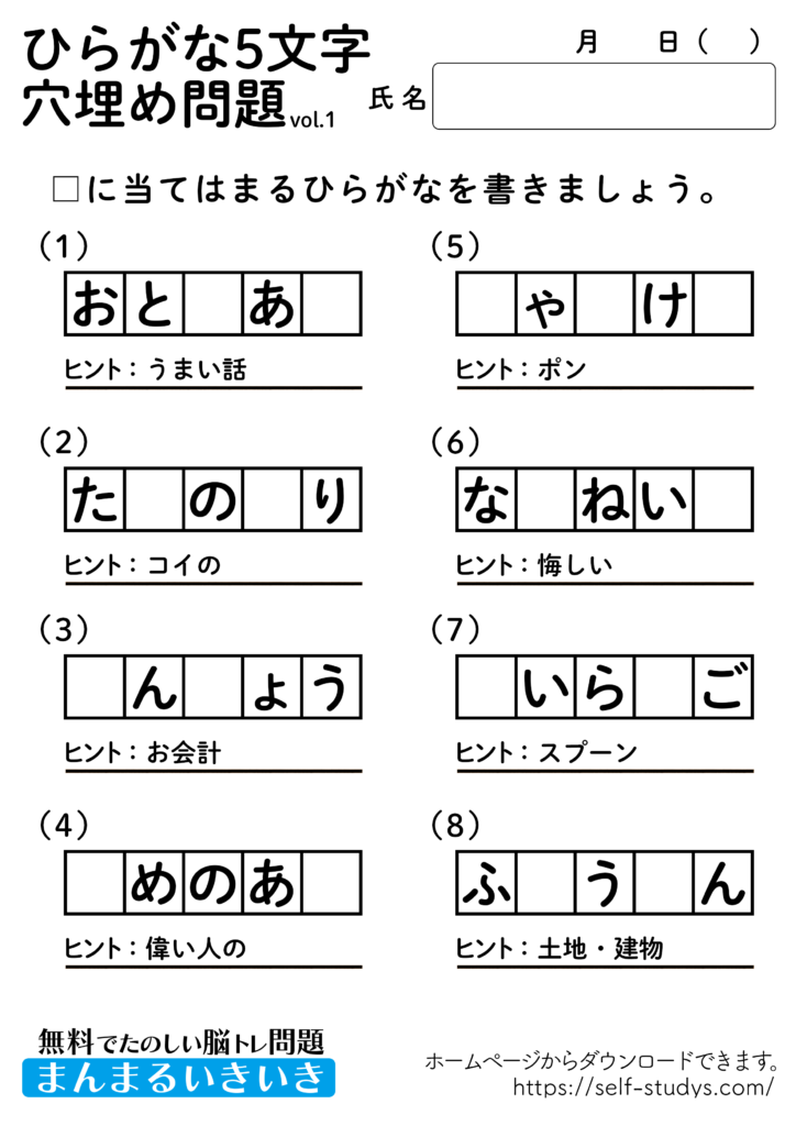 ひらがな5文字穴埋めパズル1 2022.08.16 2022.07.25 ひらがな5文字穴埋めパズル1問題はすべて無料で使えます。下記の画像、もしくは、【問題ダウンロード】をクリックして印刷してご利用ください。 問題ダウンロード答えダウンロード 意外と出てこないひらがなの穴埋め問題。わかんないと思ったらヒントを見ながら、問題を解きましょう。楽しく、ワイワイとできるので、いろんな角度から単語を頭に浮かべるので、思考力が向上し脳の活性化につながります。いつまでも健康でいられるお手伝いが出来たら幸せです。