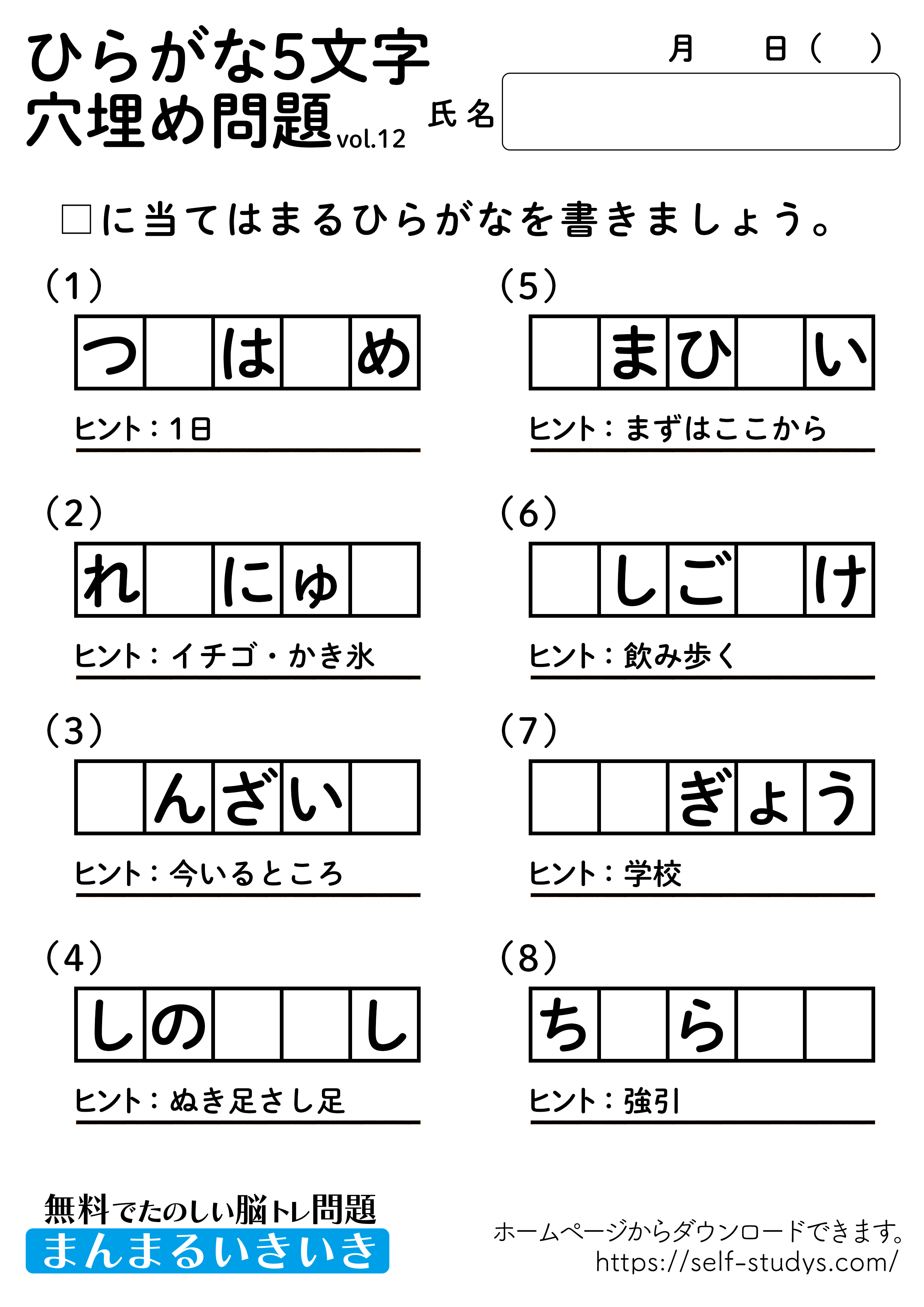 ひらがな5文字穴埋めパズル12 2022.07.26 ひらがな5文字穴埋めパズル12問題はすべて無料で使えます。下記の画像、もしくは、【問題ダウンロード】をクリックして印刷してご利用ください。 問題ダウンロード答えダウンロード 意外と出てこないひらがなの穴埋め問題。わかんないと思ったらヒントを見ながら、問題を解きましょう。楽しく、ワイワイとできるので、いろんな角度から単語を頭に浮かべるので、思考力が向上し脳の活性化につながります。いつまでも健康でいられるお手伝いが出来たら幸せです。