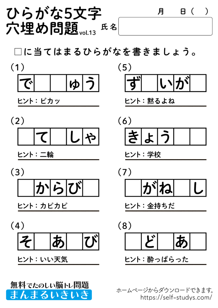 ひらがな5文字穴埋めパズル13 2022.07.26 ひらがな5文字穴埋めパズル13問題はすべて無料で使えます。下記の画像、もしくは、【問題ダウンロード】をクリックして印刷してご利用ください。 問題ダウンロード答えダウンロード 意外と出てこないひらがなの穴埋め問題。わかんないと思ったらヒントを見ながら、問題を解きましょう。楽しく、ワイワイとできるので、いろんな角度から単語を頭に浮かべるので、思考力が向上し脳の活性化につながります。いつまでも健康でいられるお手伝いが出来たら幸せです。