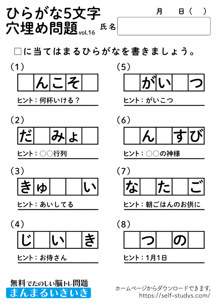 ひらがな5文字穴埋めパズル16 2022.07.26 ひらがな5文字穴埋めパズル問題はすべて無料で使えます。下記の画像、もしくは、【問題ダウンロード】をクリックして印刷してご利用ください。 問題ダウンロード答えダウンロード 意外と出てこないひらがなの穴埋め問題。わかんないと思ったらヒントを見ながら、問題を解きましょう。楽しく、ワイワイとできるので、いろんな角度から単語を頭に浮かべるので、思考力が向上し脳の活性化につながります。いつまでも健康でいられるお手伝いが出来たら幸せです。