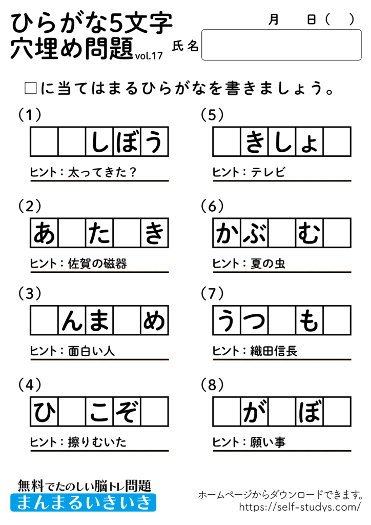 ひらがな5文字穴埋めパズル17 2022.07.26 ひらがな5文字穴埋めパズル17問題はすべて無料で使えます。下記の画像、もしくは、【問題ダウンロード】をクリックして印刷してご利用ください。 問題ダウンロード答えダウンロード 意外と出てこないひらがなの穴埋め問題。わかんないと思ったらヒントを見ながら、問題を解きましょう。楽しく、ワイワイとできるので、いろんな角度から単語を頭に浮かべるので、思考力が向上し脳の活性化につながります。いつまでも健康でいられるお手伝いが出来たら幸せです。