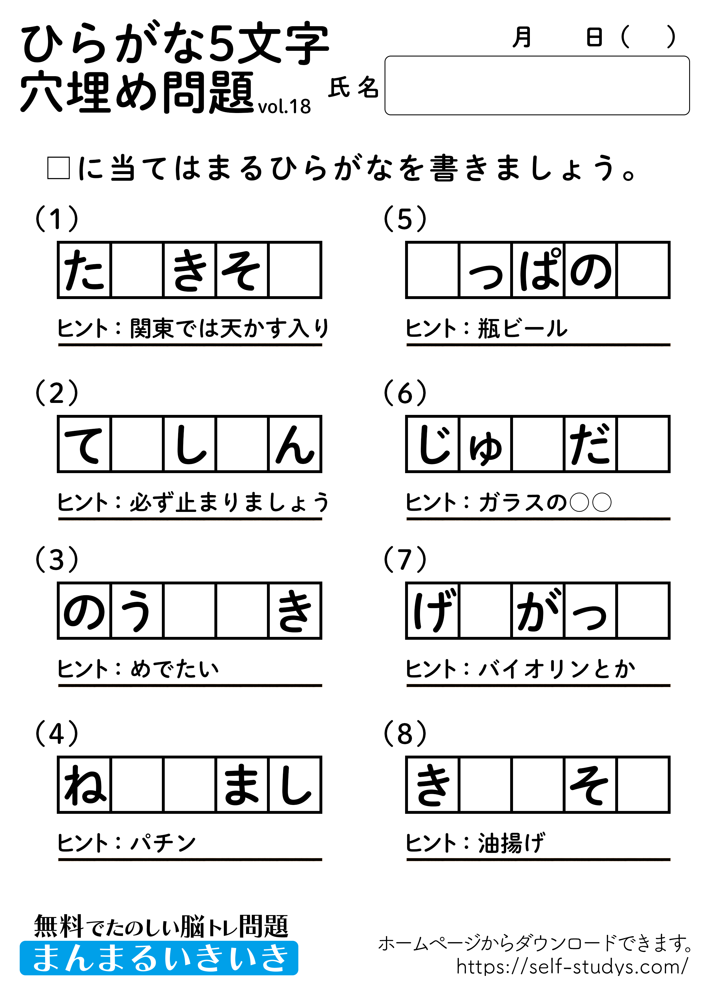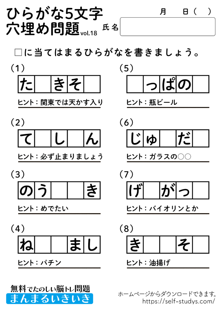 ひらがな5文字穴埋めパズル18 2022.07.26 ひらがな5文字穴埋めパズル18問題はすべて無料で使えます。下記の画像、もしくは、【問題ダウンロード】をクリックして印刷してご利用ください。 問題ダウンロード答えダウンロード 意外と出てこないひらがなの穴埋め問題。わかんないと思ったらヒントを見ながら、問題を解きましょう。楽しく、ワイワイとできるので、いろんな角度から単語を頭に浮かべるので、思考力が向上し脳の活性化につながります。いつまでも健康でいられるお手伝いが出来たら幸せです。