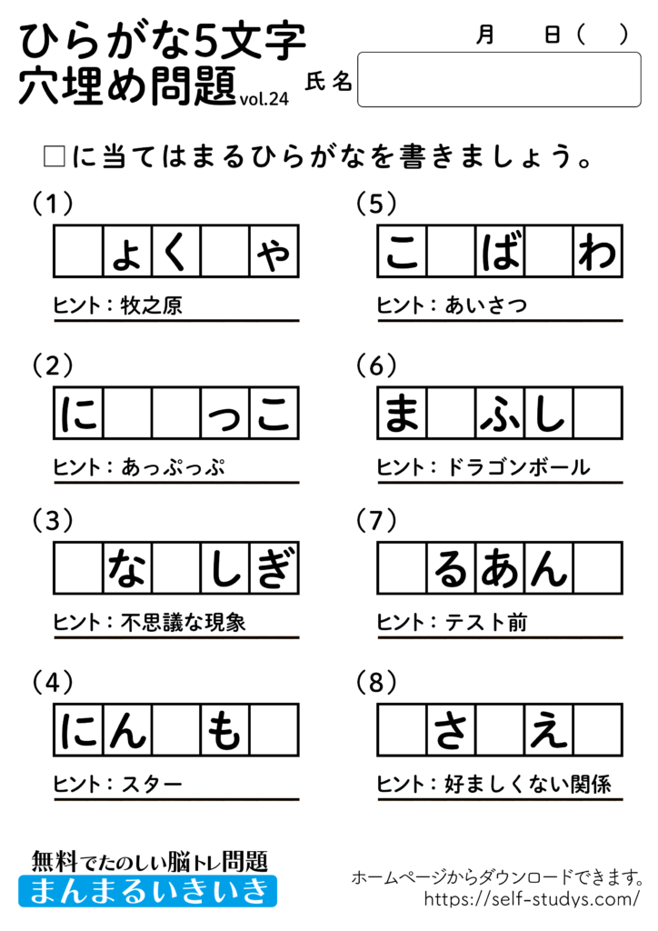 ひらがな5文字穴埋めパズル24 2022.08.19 2022.07.27 ひらがな5文字穴埋めパズル24問題はすべて無料で使えます。下記の画像、もしくは、【問題ダウンロード】をクリックして印刷してご利用ください。 問題ダウンロード答えダウンロード 意外と出てこないひらがなの穴埋め問題。わかんないと思ったらヒントを見ながら、問題を解きましょう。楽しく、ワイワイとできるので、いろんな角度から単語を頭に浮かべるので、思考力が向上し脳の活性化につながります。いつまでも健康でいられるお手伝いが出来たら幸せです。