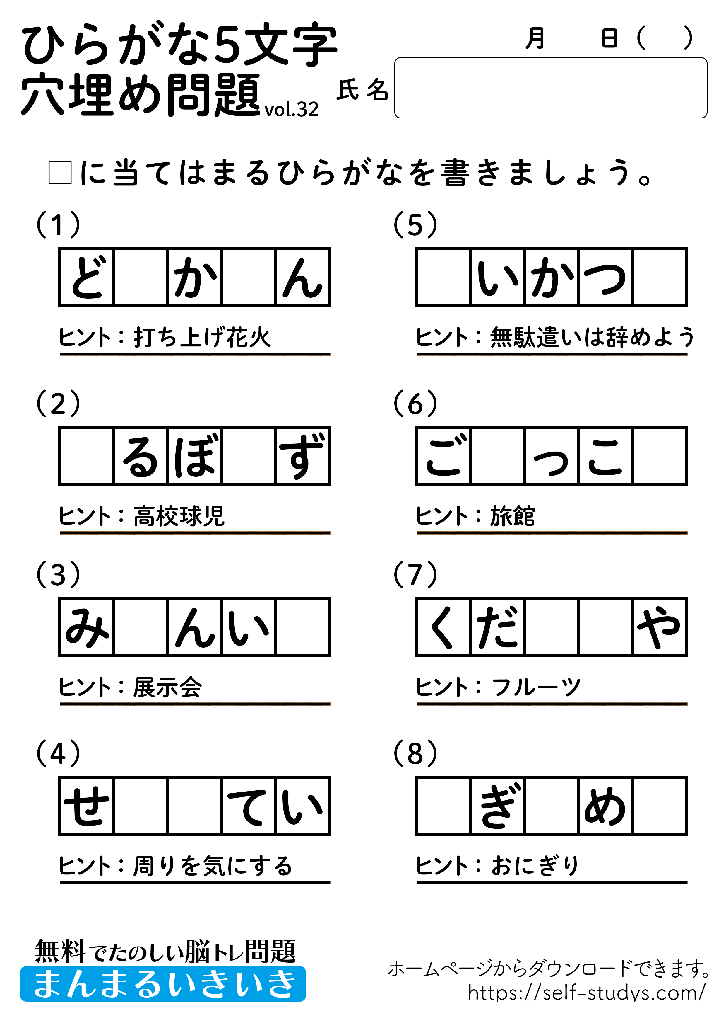ひらがな5文字穴埋めパズル32 2022.07.27 ひらがな5文字穴埋めパズル32問題はすべて無料で使えます。下記の画像、もしくは、【問題ダウンロード】をクリックして印刷してご利用ください。 問題ダウンロード答えダウンロード 意外と出てこないひらがなの穴埋め問題。わかんないと思ったらヒントを見ながら、問題を解きましょう。楽しく、ワイワイとできるので、いろんな角度から単語を頭に浮かべるので、思考力が向上し脳の活性化につながります。いつまでも健康でいられるお手伝いが出来たら幸せです。