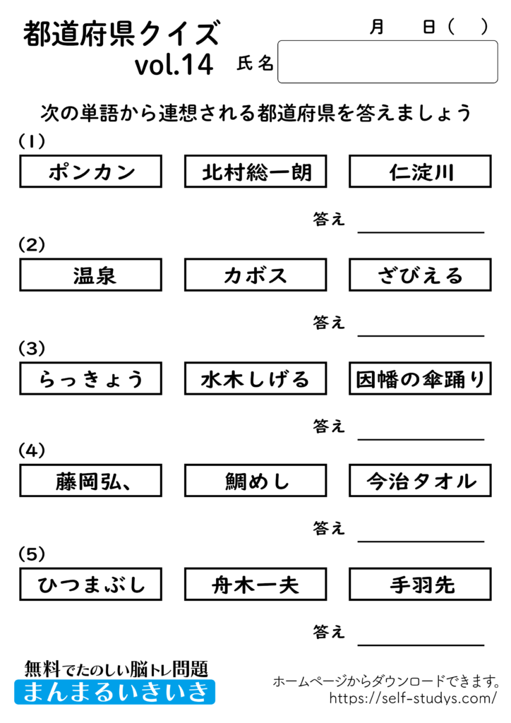 都道府県クイズ14 2022.08.03 都道府県クイズ14問題はすべて無料で使えます。下記の画像、もしくは、【問題ダウンロード】をクリックして印刷してご利用ください。 問題ダウンロード答えダウンロード 一度は聞いたことのある、都道府県のキーワード。旅行に行ったり、お土産をもらったり、好きな有名人の出身地で覚えているっていうことがあると思います。自分の住んでいるところ、となりのところなど、様々な得意分野で問題を解いていったください。いつまでも健康でいられるお手伝いが出来たら幸せです。