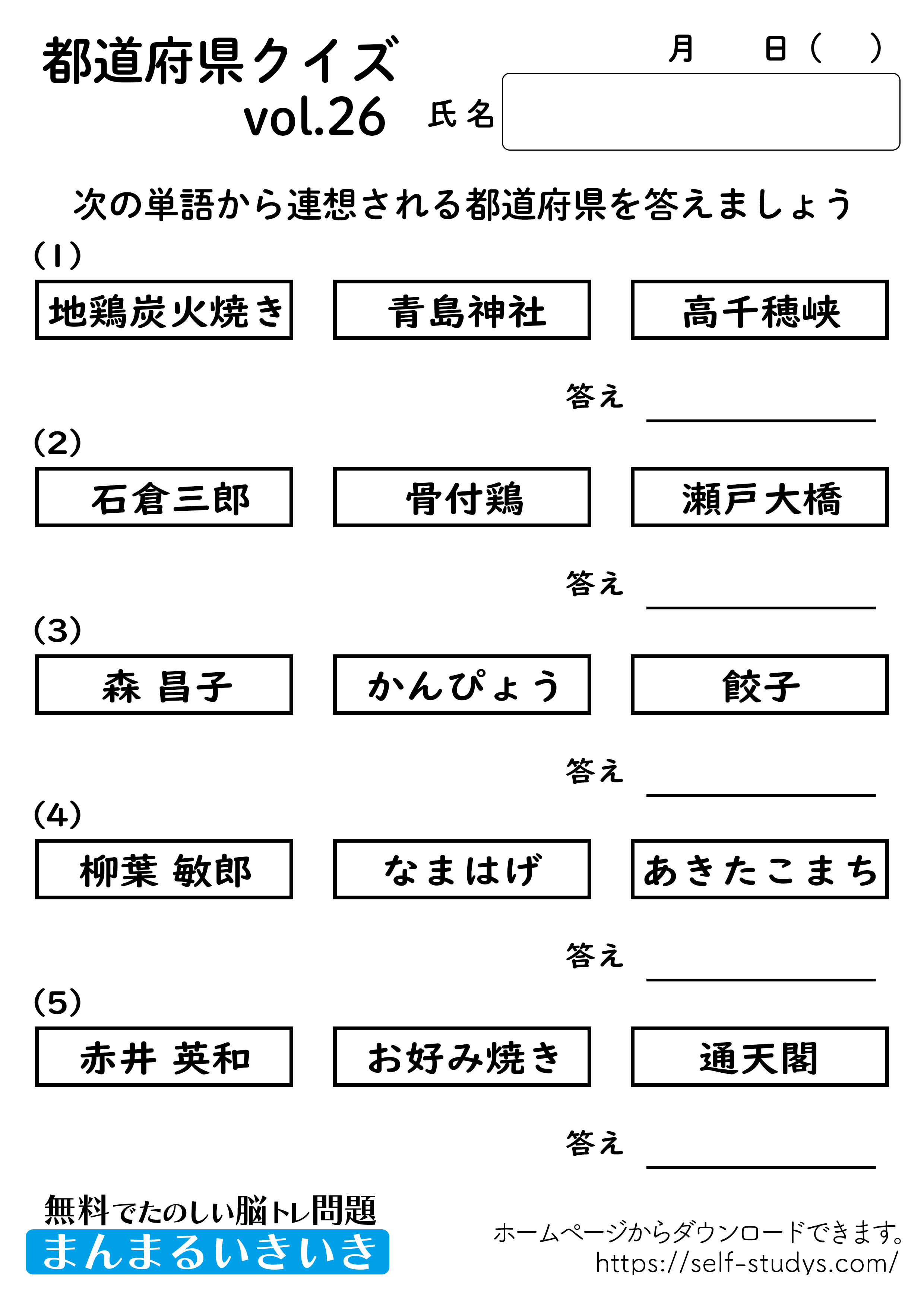 都道府県クイズ26 2022.08.04 都道府県クイズ26問題はすべて無料で使えます。下記の画像、もしくは、【問題ダウンロード】をクリックして印刷してご利用ください。 問題ダウンロード答えダウンロード 一度は聞いたことのある、都道府県のキーワード。旅行に行ったり、お土産をもらったり、好きな有名人の出身地で覚えているっていうことがあると思います。自分の住んでいるところ、となりのところなど、様々な得意分野で問題を解いていったください。いつまでも健康でいられるお手伝いが出来たら幸せです。