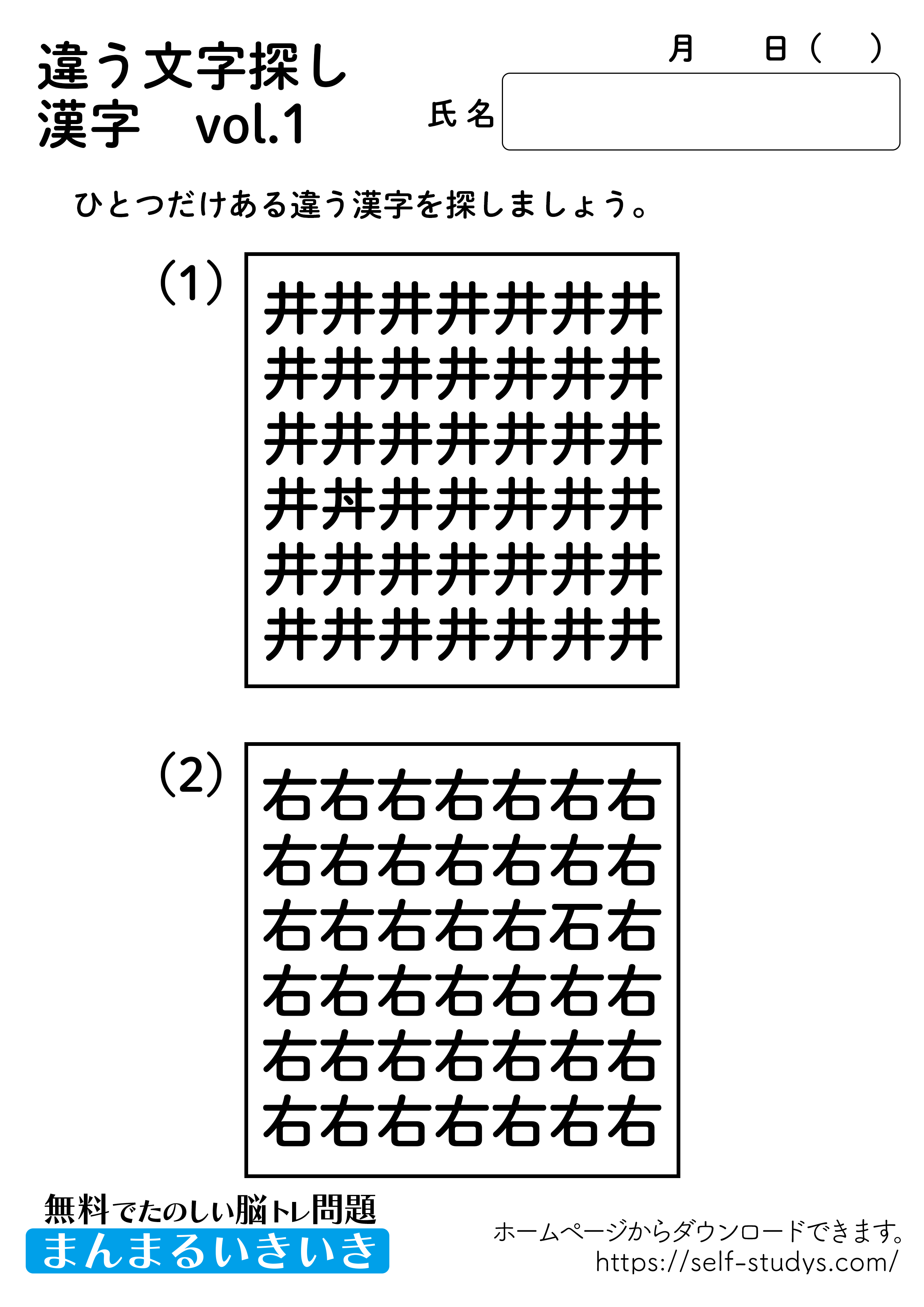 違う文字探し漢字1 2022.08.17 違う文字探し漢字1問題はすべて無料で使えます。下記の画像、もしくは、【問題ダウンロード】をクリックして印刷してご利用ください。 問題ダウンロード答えダウンロード 動体視力・観察眼を鍛えるプリントです。いつまでも健康でいられるお手伝いが出来たら幸せです。