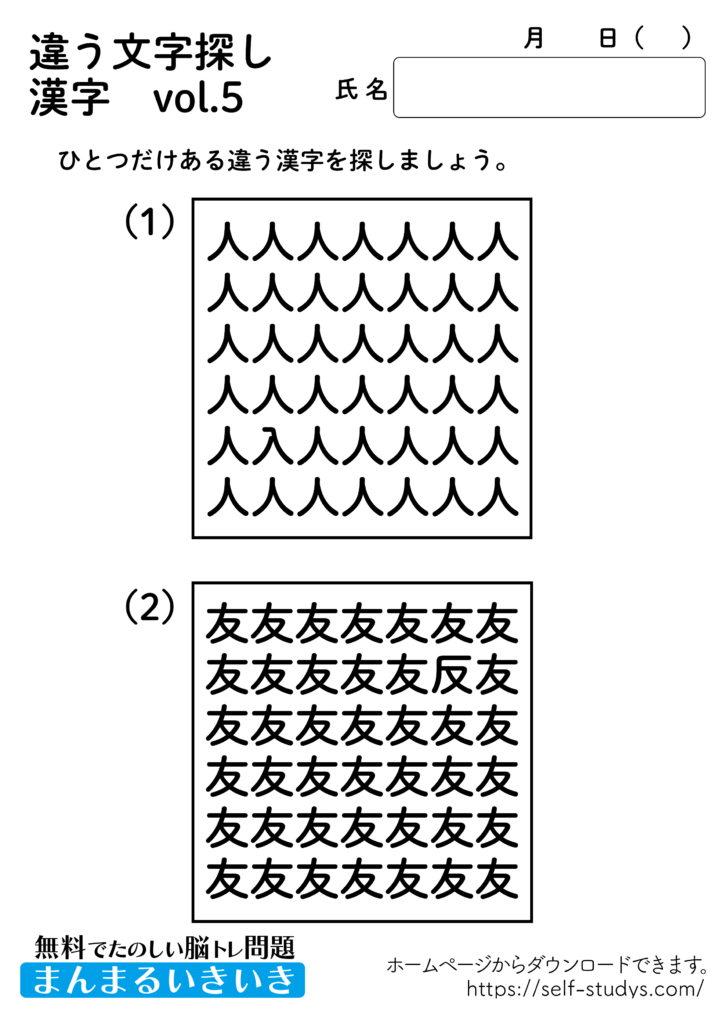 違う文字探し漢字5 2022.08.17 違う文字探し漢字5問題はすべて無料で使えます。下記の画像、もしくは、【問題ダウンロード】をクリックして印刷してご利用ください。 問題ダウンロード答えダウンロード 動体視力・観察眼を鍛えるプリントです。いつまでも健康でいられるお手伝いが出来たら幸せです。