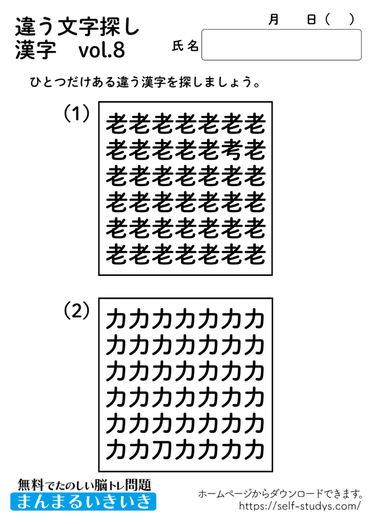 違う文字探し漢字8 2022.08.17 違う文字探し漢字8問題はすべて無料で使えます。下記の画像、もしくは、【問題ダウンロード】をクリックして印刷してご利用ください。 問題ダウンロード答えダウンロード 動体視力・観察眼を鍛えるプリントです。いつまでも健康でいられるお手伝いが出来たら幸せです。