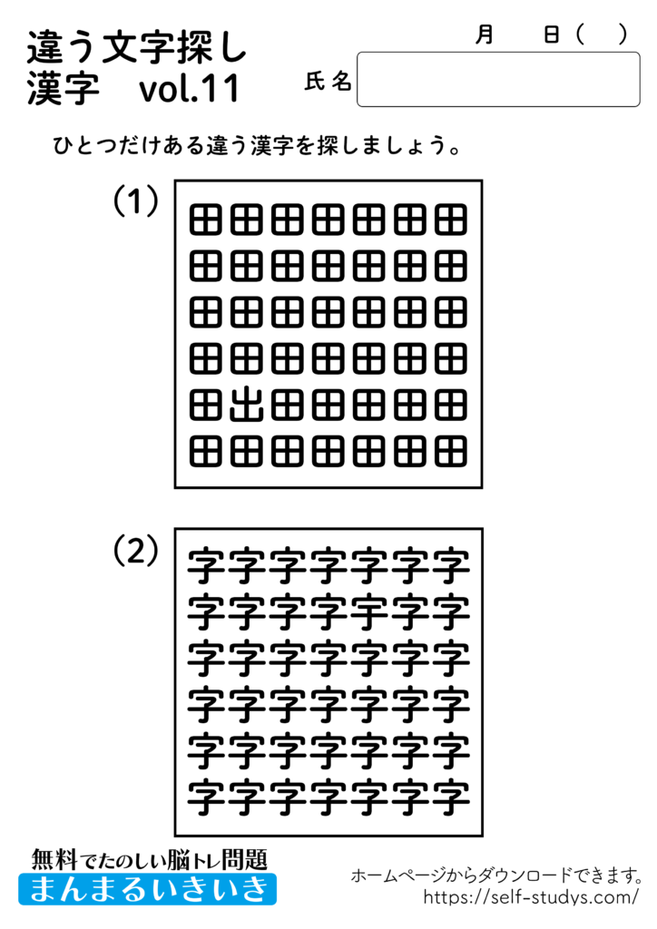 違う文字探し漢字11 2022.08.17 違う文字探し漢字11問題はすべて無料で使えます。下記の画像、もしくは、【問題ダウンロード】をクリックして印刷してご利用ください。 問題ダウンロード答えダウンロード 動体視力・観察眼を鍛えるプリントです。いつまでも健康でいられるお手伝いが出来たら幸せです。