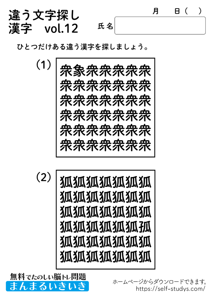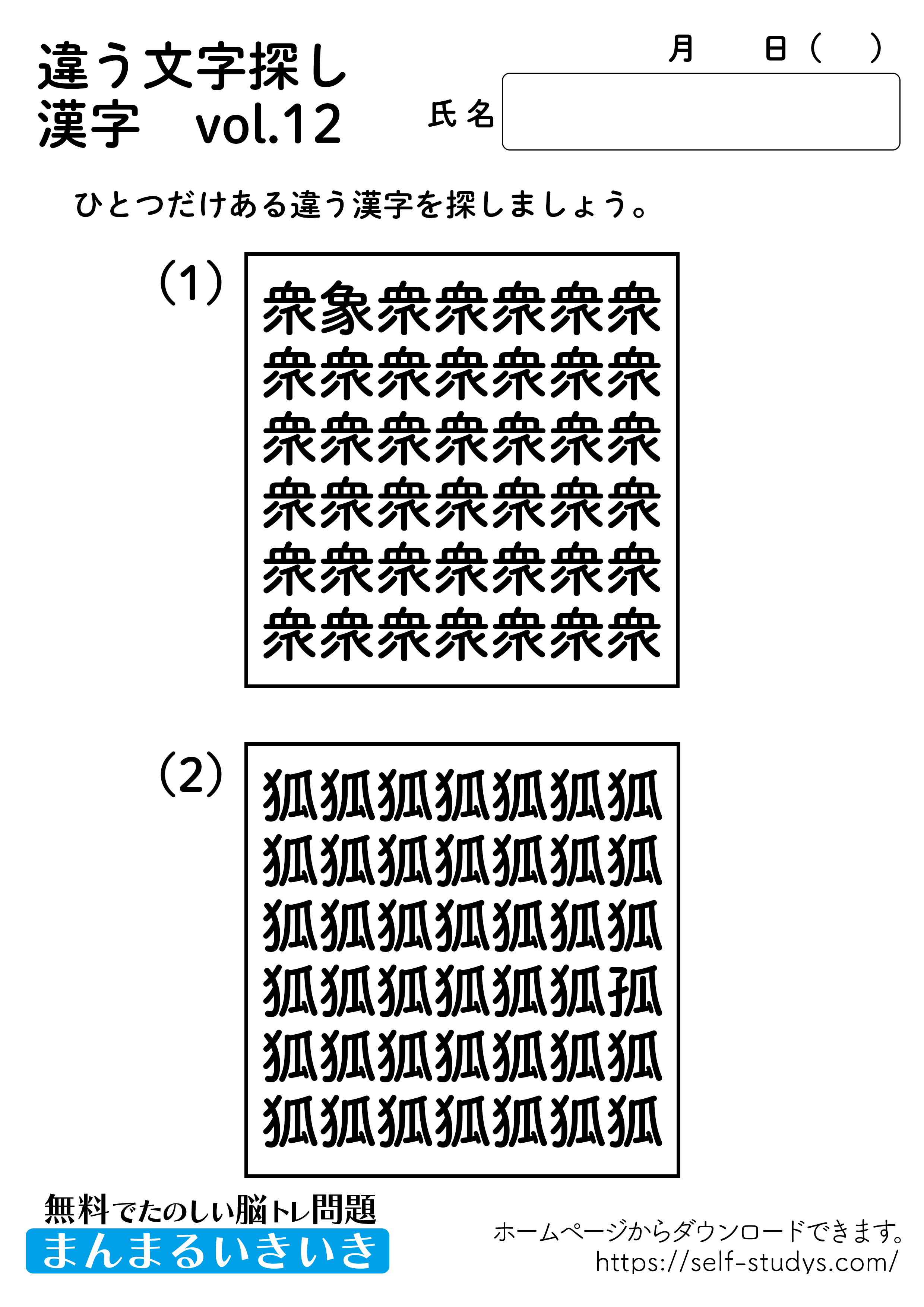 違う文字探し漢字12 2022.08.17 違う文字探し漢字12問題はすべて無料で使えます。下記の画像、もしくは、【問題ダウンロード】をクリックして印刷してご利用ください。 問題ダウンロード答えダウンロード 動体視力・観察眼を鍛えるプリントです。いつまでも健康でいられるお手伝いが出来たら幸せです。