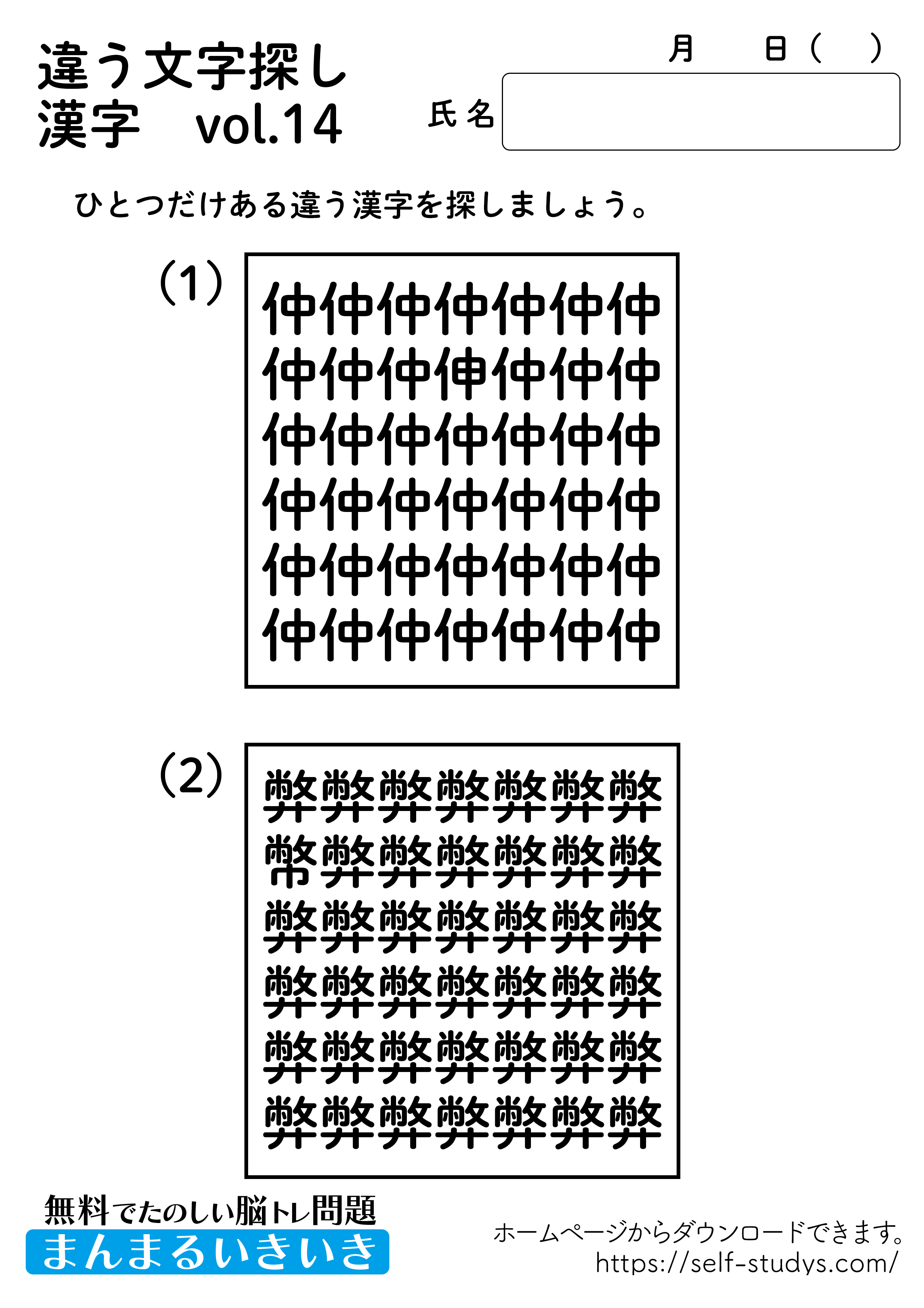 違う文字探し漢字14 2022.08.17 違う文字探し漢字14問題はすべて無料で使えます。下記の画像、もしくは、【問題ダウンロード】をクリックして印刷してご利用ください。 問題ダウンロード答えダウンロード 動体視力・観察眼を鍛えるプリントです。いつまでも健康でいられるお手伝いが出来たら幸せです。