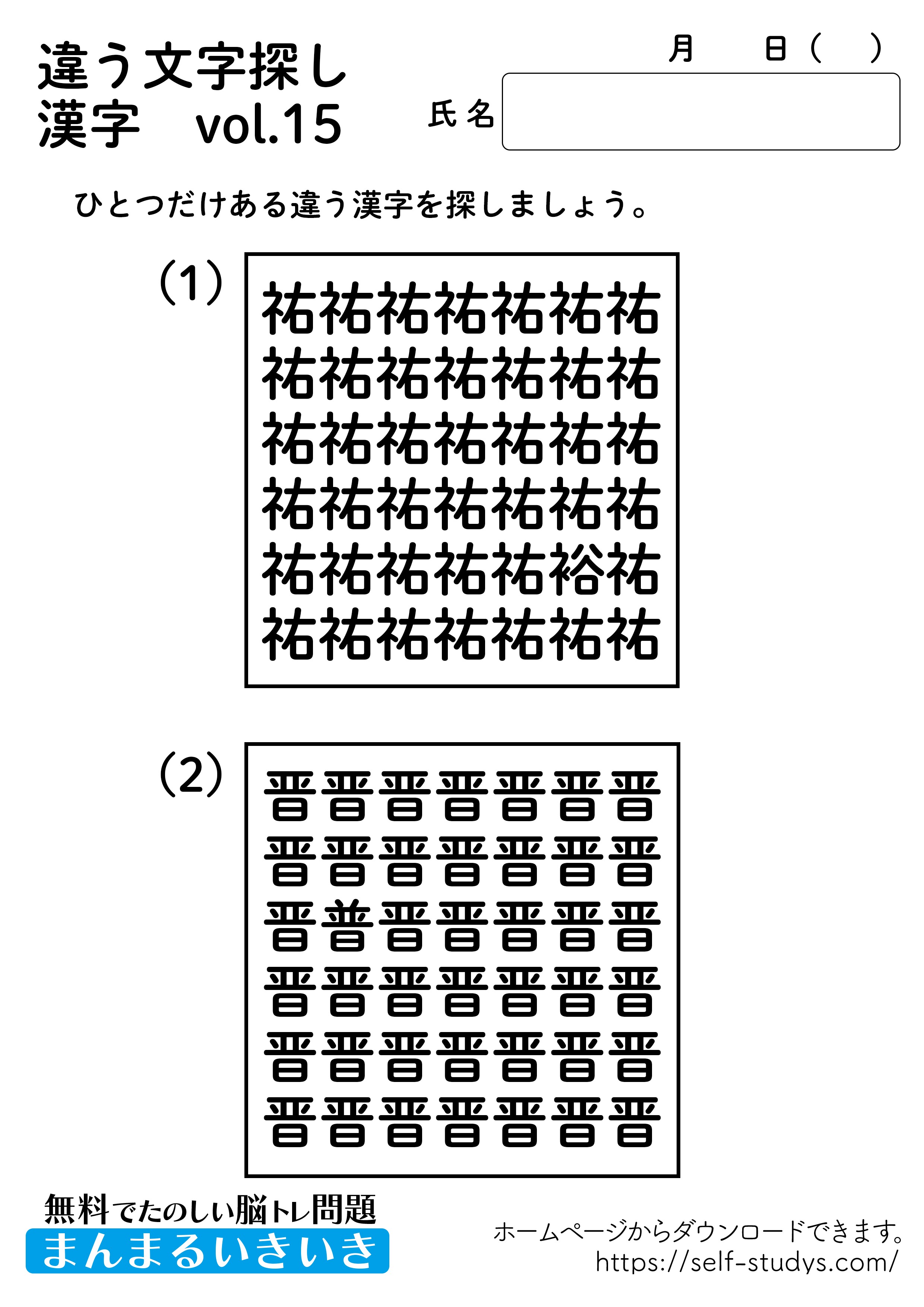 違う文字探し漢字15 2022.08.17 違う文字探し漢字15問題はすべて無料で使えます。下記の画像、もしくは、【問題ダウンロード】をクリックして印刷してご利用ください。 問題ダウンロード答えダウンロード 動体視力・観察眼を鍛えるプリントです。いつまでも健康でいられるお手伝いが出来たら幸せです。