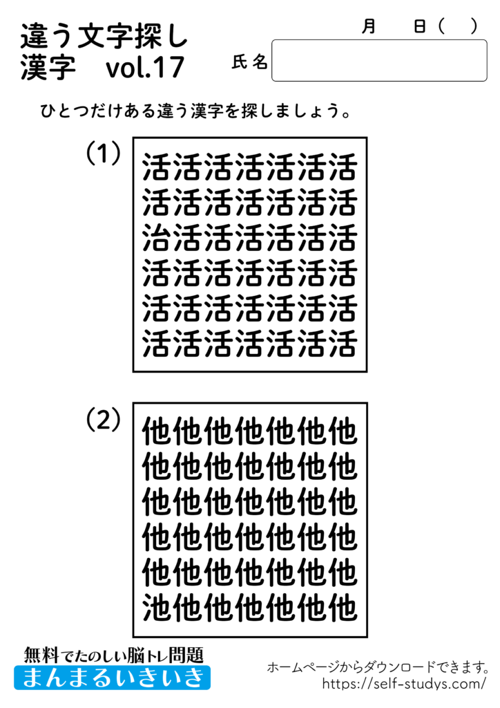 違う文字探し漢字17 2022.08.17 違う文字探し漢字17問題はすべて無料で使えます。下記の画像、もしくは、【問題ダウンロード】をクリックして印刷してご利用ください。 問題ダウンロード答えダウンロード 動体視力・観察眼を鍛えるプリントです。いつまでも健康でいられるお手伝いが出来たら幸せです。