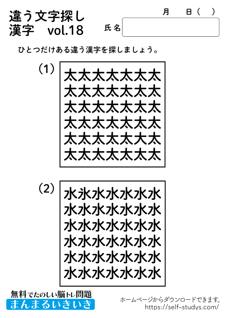 違う文字探し漢字18 2022.08.17 違う文字探し漢字18問題はすべて無料で使えます。下記の画像、もしくは、【問題ダウンロード】をクリックして印刷してご利用ください。 問題ダウンロード答えダウンロード 動体視力・観察眼を鍛えるプリントです。いつまでも健康でいられるお手伝いが出来たら幸せです。