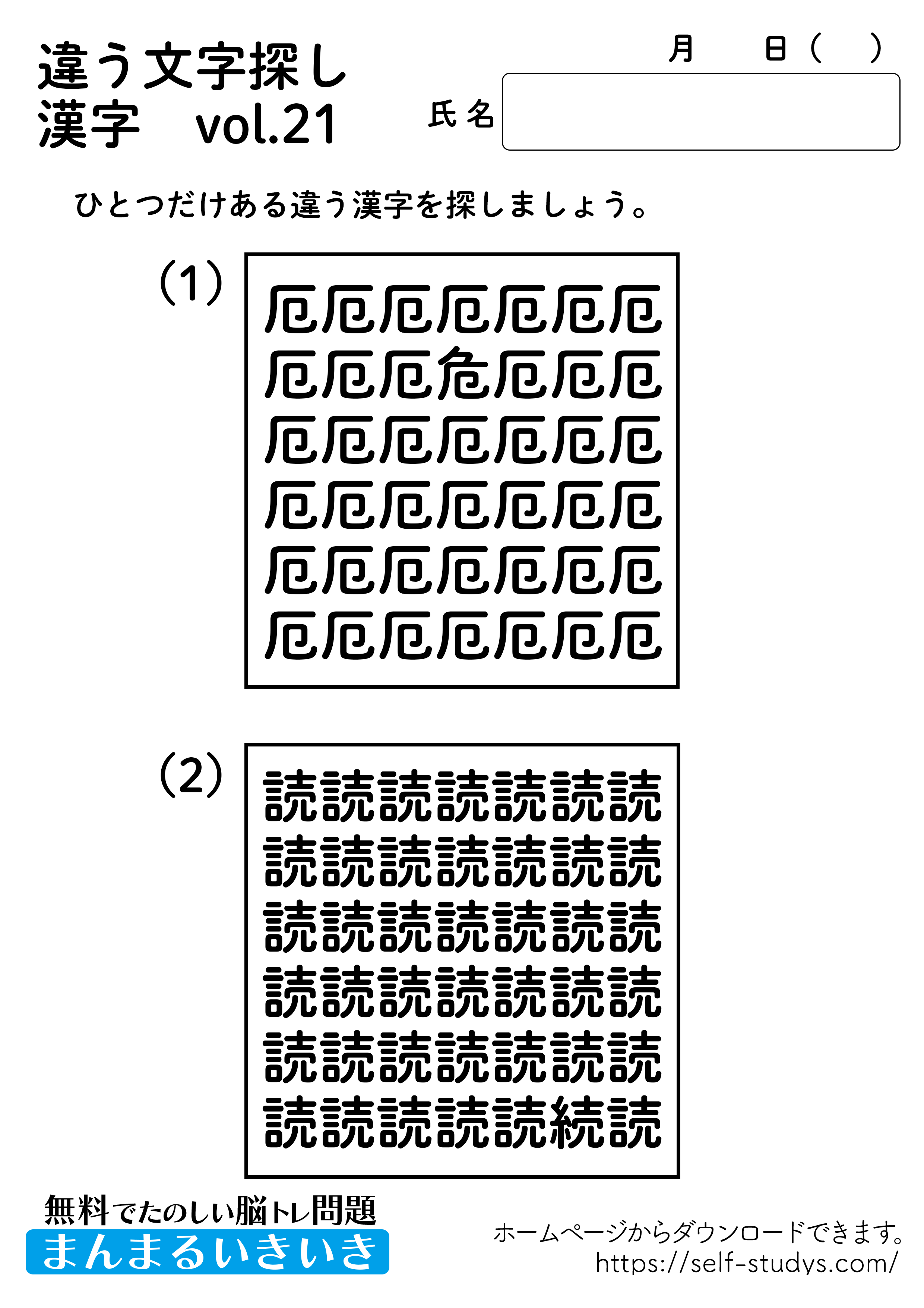 違う文字探し漢字21 2022.08.17 違う文字探し漢字21問題はすべて無料で使えます。下記の画像、もしくは、【問題ダウンロード】をクリックして印刷してご利用ください。 問題ダウンロード答えダウンロード 動体視力・観察眼を鍛えるプリントです。いつまでも健康でいられるお手伝いが出来たら幸せです。