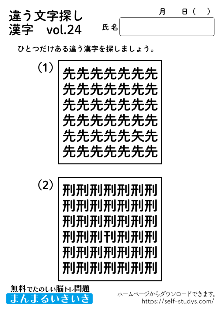 違う文字探し漢字24 2022.08.17 違う文字探し漢字24問題はすべて無料で使えます。下記の画像、もしくは、【問題ダウンロード】をクリックして印刷してご利用ください。 問題ダウンロード答えダウンロード 動体視力・観察眼を鍛えるプリントです。いつまでも健康でいられるお手伝いが出来たら幸せです。
