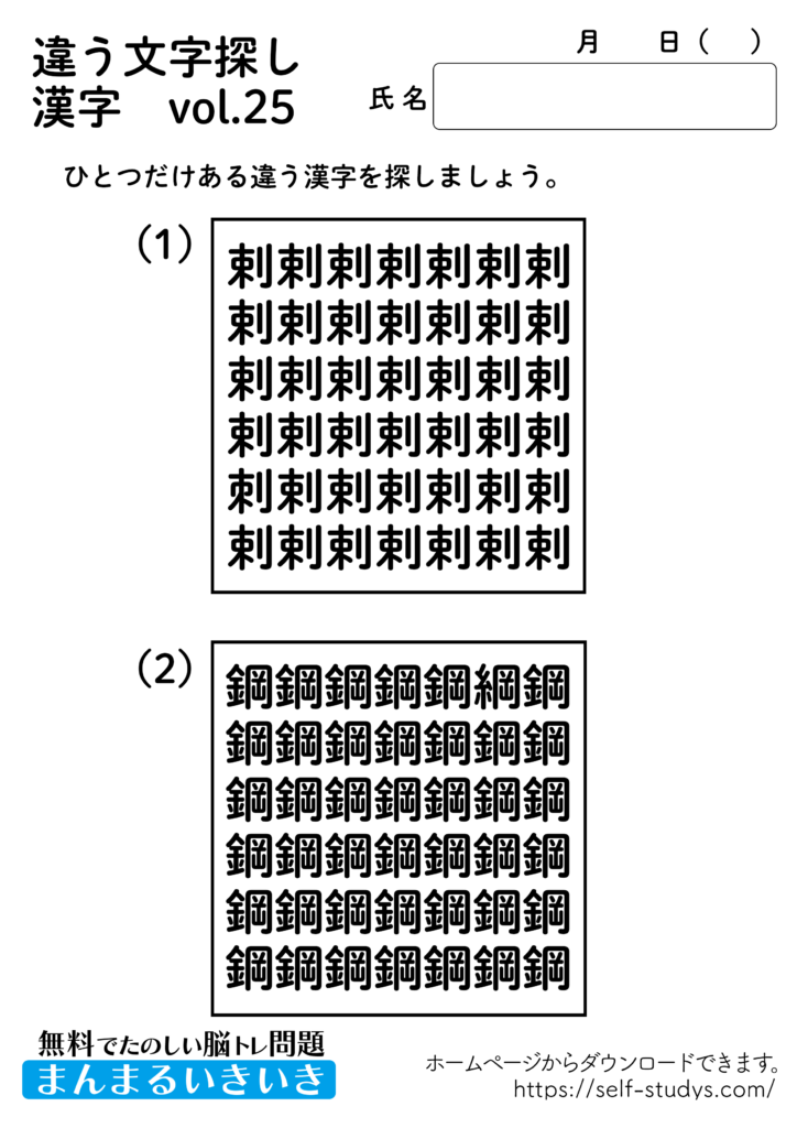 違う文字探し漢字25 2022.08.17 違う文字探し漢字25問題はすべて無料で使えます。下記の画像、もしくは、【問題ダウンロード】をクリックして印刷してご利用ください。 問題ダウンロード答えダウンロード 動体視力・観察眼を鍛えるプリントです。いつまでも健康でいられるお手伝いが出来たら幸せです。