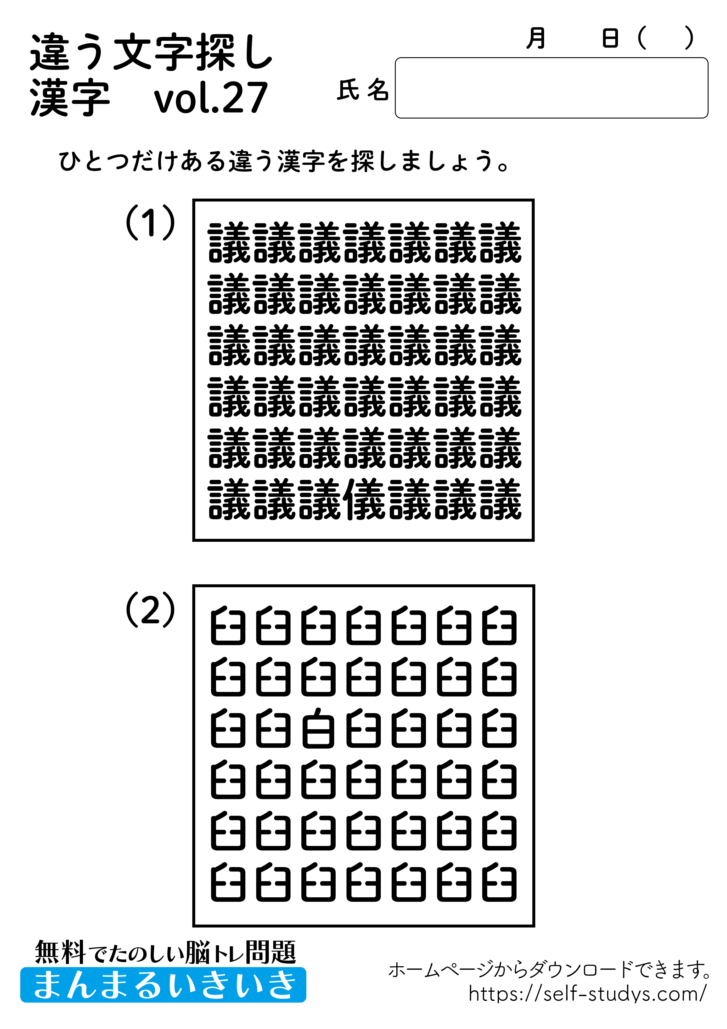 違う文字探し漢字27 2022.08.17 違う文字探し漢字27問題はすべて無料で使えます。下記の画像、もしくは、【問題ダウンロード】をクリックして印刷してご利用ください。 問題ダウンロード答えダウンロード 動体視力・観察眼を鍛えるプリントです。いつまでも健康でいられるお手伝いが出来たら幸せです。