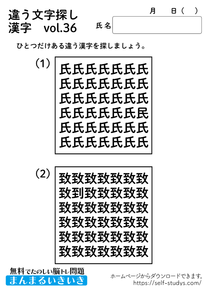 違う文字探し漢字36 2022.08.17 違う文字探し漢字36問題はすべて無料で使えます。下記の画像、もしくは、【問題ダウンロード】をクリックして印刷してご利用ください。 問題ダウンロード答えダウンロード 動体視力・観察眼を鍛えるプリントです。いつまでも健康でいられるお手伝いが出来たら幸せです。