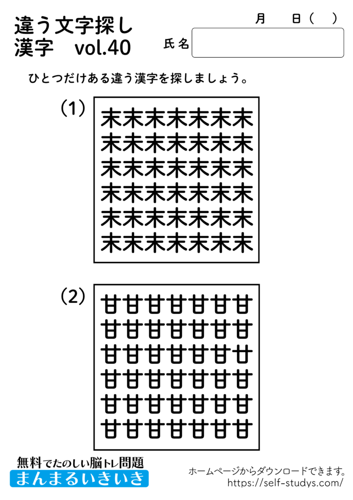 違う文字探し漢字40 2022.08.17 違う文字探し漢字40問題はすべて無料で使えます。下記の画像、もしくは、【問題ダウンロード】をクリックして印刷してご利用ください。 問題ダウンロード答えダウンロード 動体視力・観察眼を鍛えるプリントです。いつまでも健康でいられるお手伝いが出来たら幸せです。