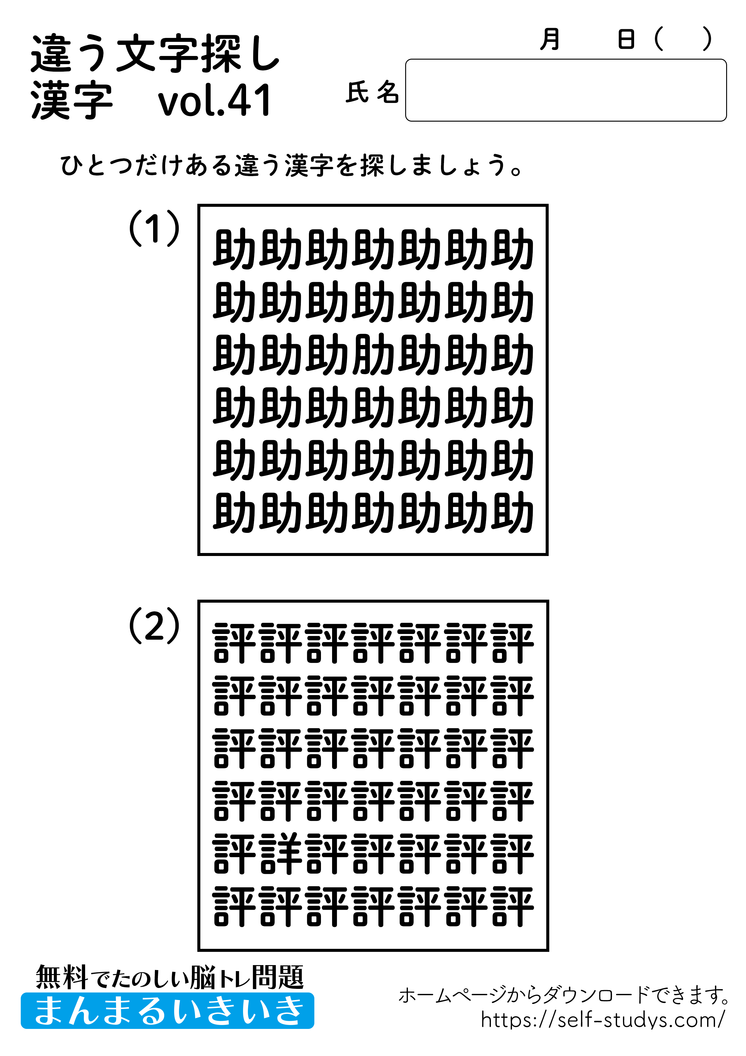 違う文字探し漢字41 2022.08.22 違う文字探し漢字41問題はすべて無料で使えます。下記の画像、もしくは、【問題ダウンロード】をクリックして印刷してご利用ください。 問題ダウンロード答えダウンロード 動体視力・観察眼を鍛えるプリントです。いつまでも健康でいられるお手伝いが出来たら幸せです。