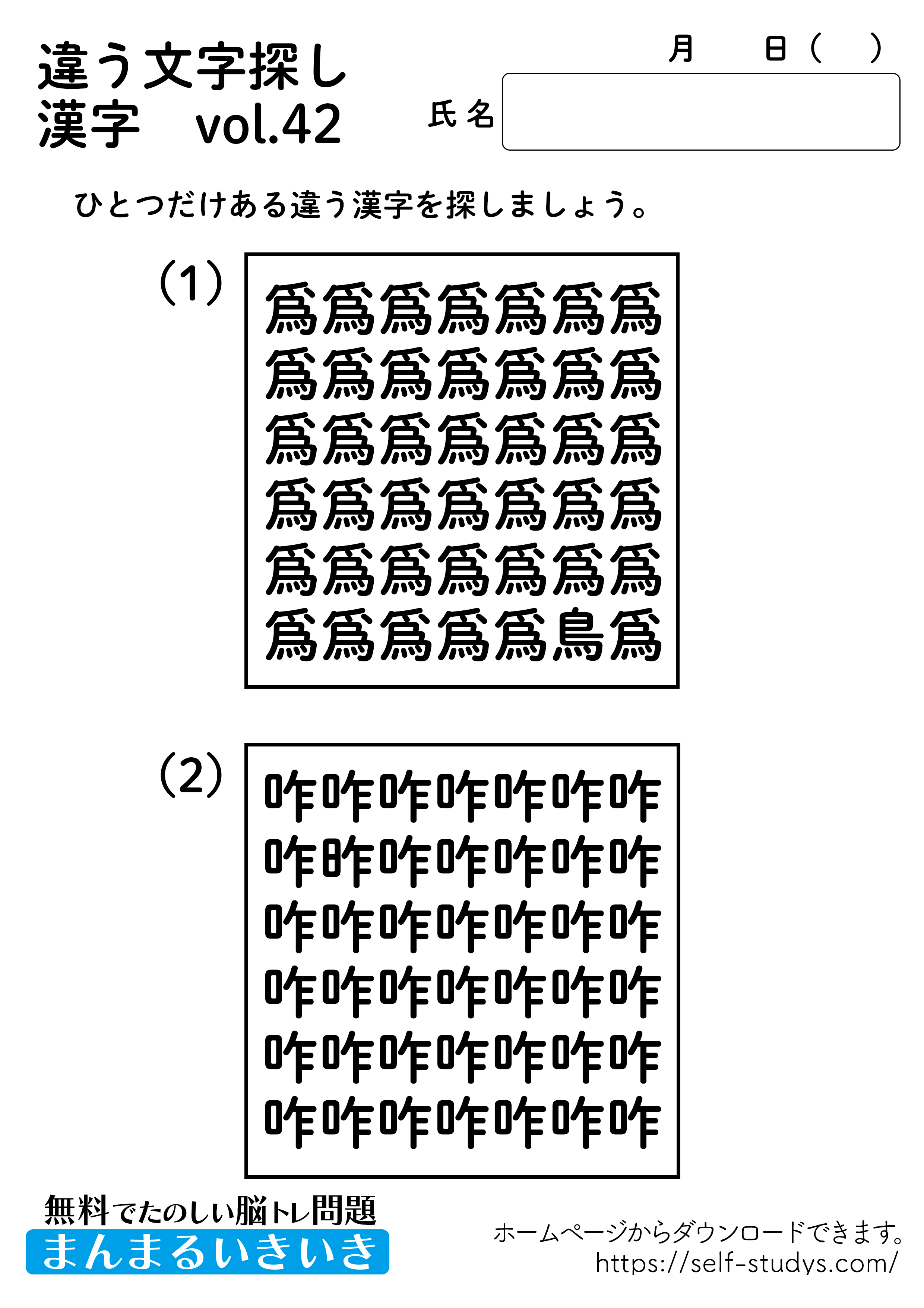違う文字探し漢字42 2022.08.22 違う文字探し漢字42問題はすべて無料で使えます。下記の画像、もしくは、【問題ダウンロード】をクリックして印刷してご利用ください。 問題ダウンロード答えダウンロード 動体視力・観察眼を鍛えるプリントです。いつまでも健康でいられるお手伝いが出来たら幸せです。