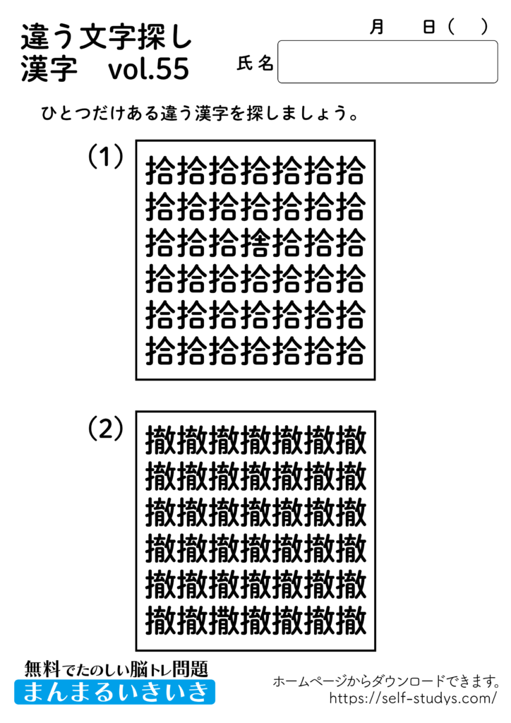 違う文字探し漢字55 2022.08.22 違う文字探し漢字55問題はすべて無料で使えます。下記の画像、もしくは、【問題ダウンロード】をクリックして印刷してご利用ください。 問題ダウンロード答えダウンロード 動体視力・観察眼を鍛えるプリントです。いつまでも健康でいられるお手伝いが出来たら幸せです。