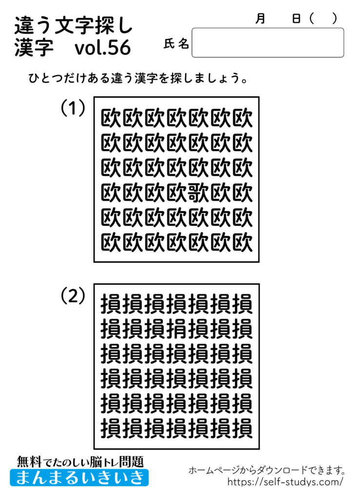 違う文字探し漢字56 2022.08.22 違う文字探し漢字56問題はすべて無料で使えます。下記の画像、もしくは、【問題ダウンロード】をクリックして印刷してご利用ください。 問題ダウンロード答えダウンロード 動体視力・観察眼を鍛えるプリントです。いつまでも健康でいられるお手伝いが出来たら幸せです。