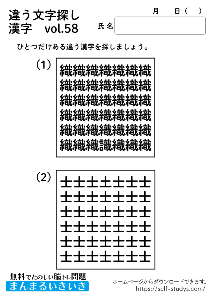 違う文字探し漢字58 2022.08.22 違う文字探し漢字58問題はすべて無料で使えます。下記の画像、もしくは、【問題ダウンロード】をクリックして印刷してご利用ください。 問題ダウンロード答えダウンロード 動体視力・観察眼を鍛えるプリントです。いつまでも健康でいられるお手伝いが出来たら幸せです。