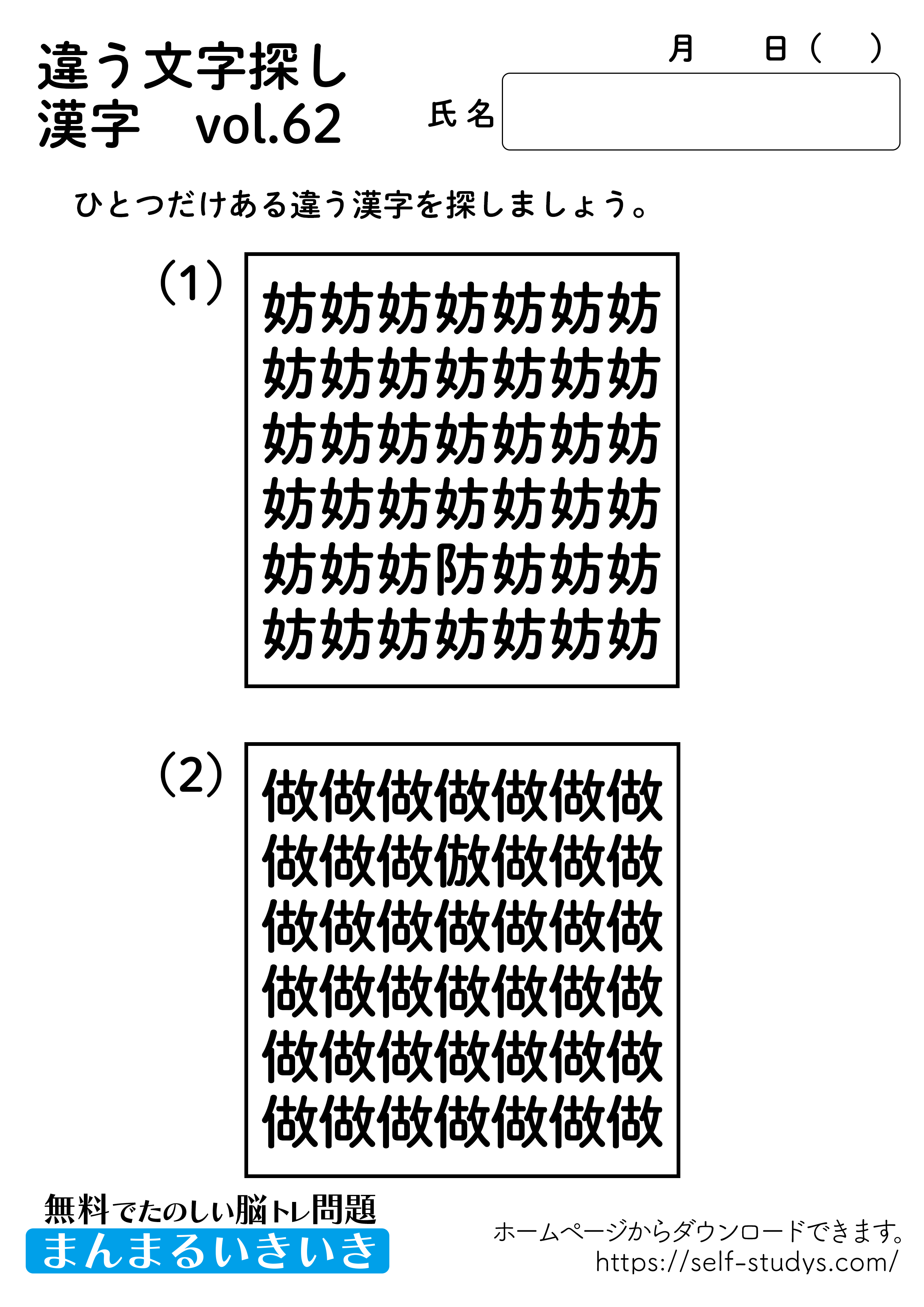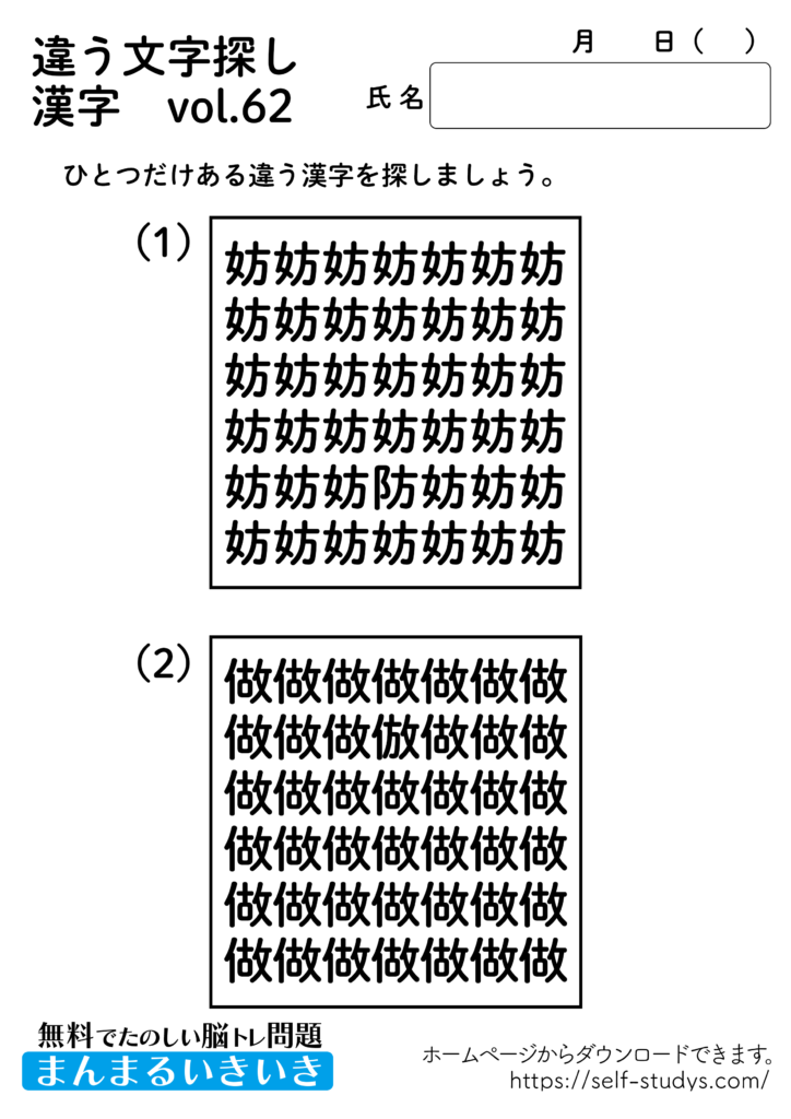 違う文字探し漢字62 2022.08.22 違う文字探し漢字62問題はすべて無料で使えます。下記の画像、もしくは、【問題ダウンロード】をクリックして印刷してご利用ください。 問題ダウンロード答えダウンロード 動体視力・観察眼を鍛えるプリントです。いつまでも健康でいられるお手伝いが出来たら幸せです。
