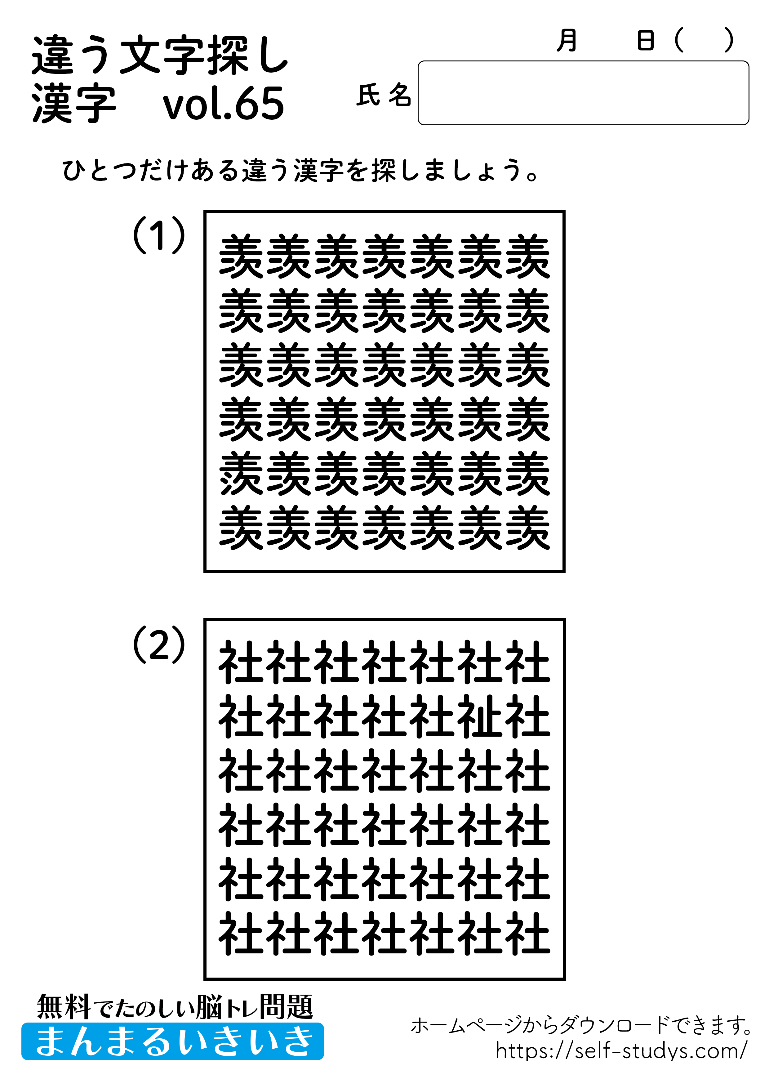 違う文字探し漢字65 2022.08.22 違う文字探し漢字65問題はすべて無料で使えます。下記の画像、もしくは、【問題ダウンロード】をクリックして印刷してご利用ください。 問題ダウンロード答えダウンロード 動体視力・観察眼を鍛えるプリントです。いつまでも健康でいられるお手伝いが出来たら幸せです。
