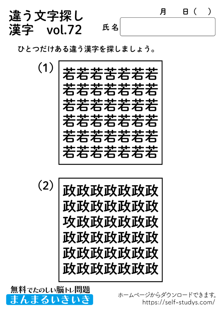 違う文字探し漢字72 2022.08.22 違う文字探し漢字72問題はすべて無料で使えます。下記の画像、もしくは、【問題ダウンロード】をクリックして印刷してご利用ください。 問題ダウンロード答えダウンロード 動体視力・観察眼を鍛えるプリントです。いつまでも健康でいられるお手伝いが出来たら幸せです。