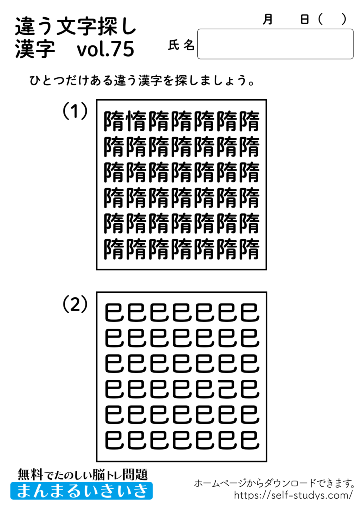 違う文字探し漢字75 2022.08.22 違う文字探し漢字75問題はすべて無料で使えます。下記の画像、もしくは、【問題ダウンロード】をクリックして印刷してご利用ください。 問題ダウンロード答えダウンロード 動体視力・観察眼を鍛えるプリントです。いつまでも健康でいられるお手伝いが出来たら幸せです。