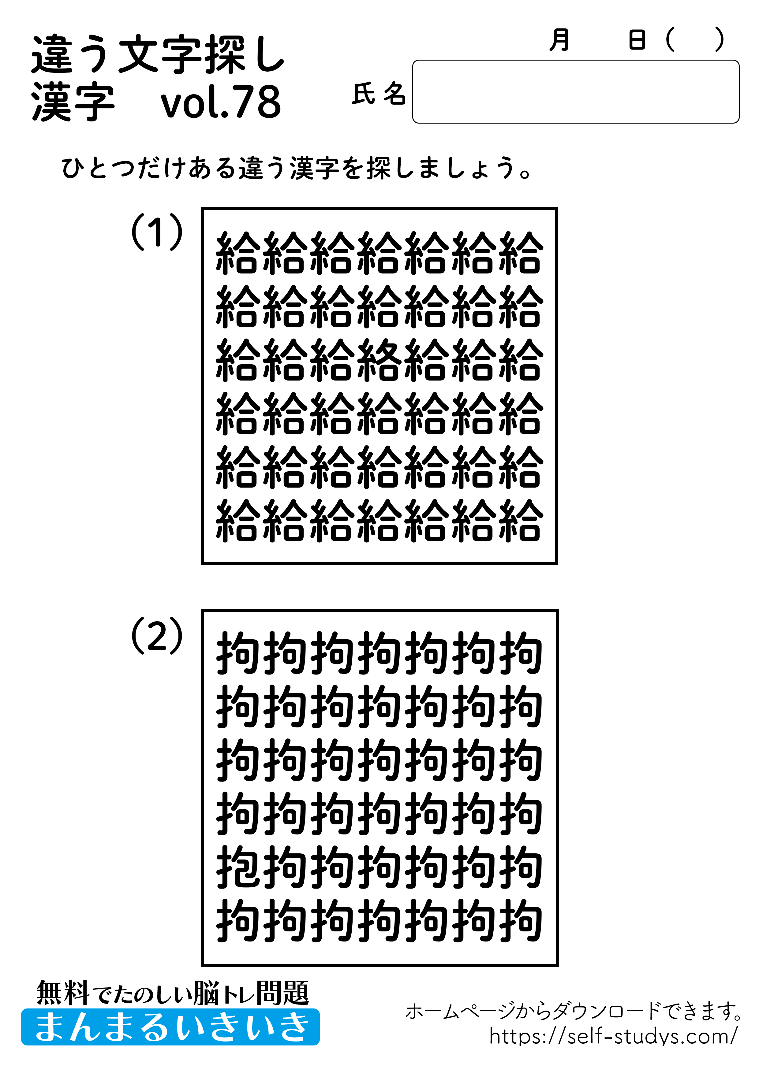 違う文字探し漢字78 2022.08.22 違う文字探し漢字78問題はすべて無料で使えます。下記の画像、もしくは、【問題ダウンロード】をクリックして印刷してご利用ください。 問題ダウンロード答えダウンロード 動体視力・観察眼を鍛えるプリントです。いつまでも健康でいられるお手伝いが出来たら幸せです。