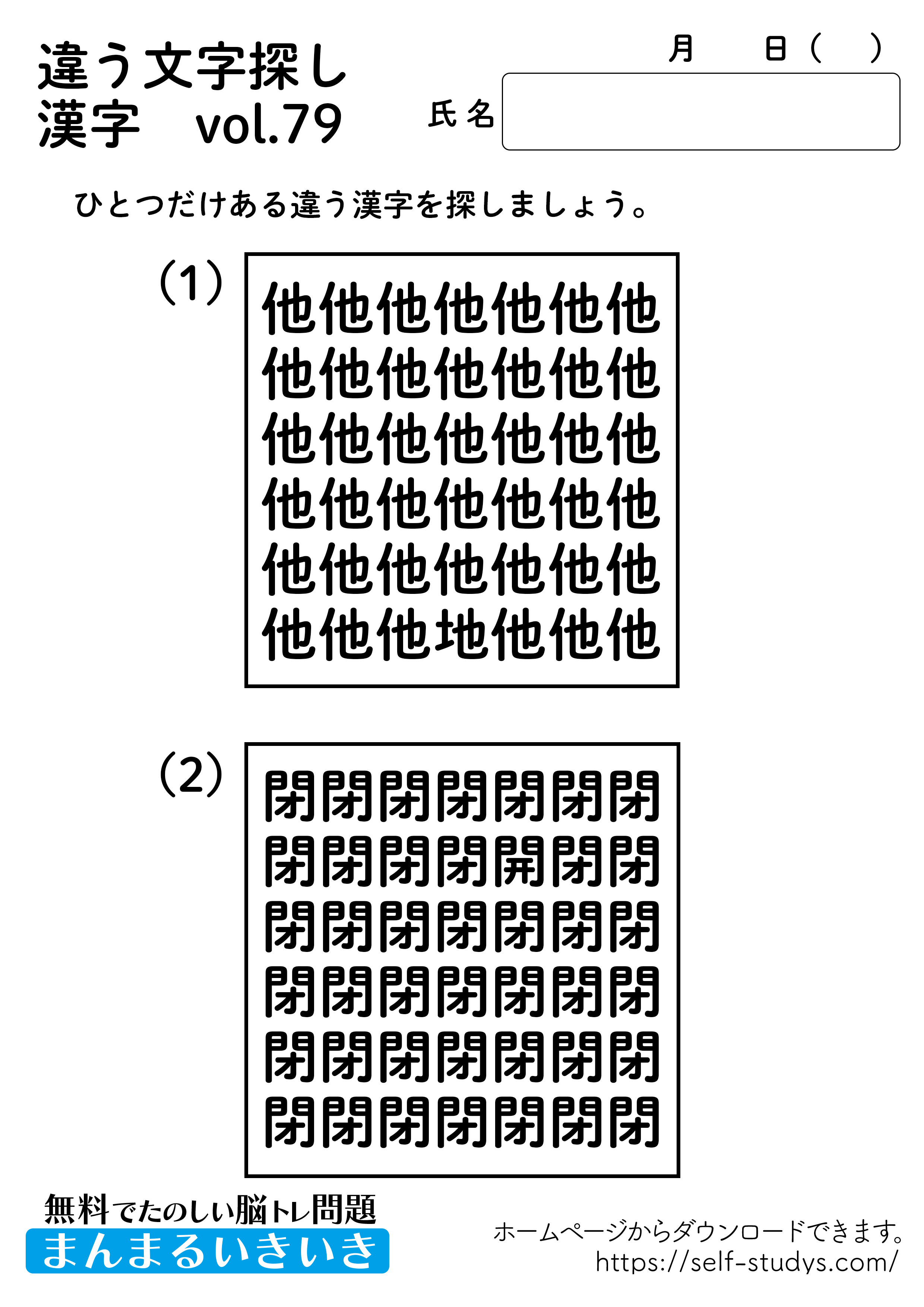 違う文字探し漢字79 2022.08.22 違う文字探し漢字79問題はすべて無料で使えます。下記の画像、もしくは、【問題ダウンロード】をクリックして印刷してご利用ください。 問題ダウンロード答えダウンロード 動体視力・観察眼を鍛えるプリントです。いつまでも健康でいられるお手伝いが出来たら幸せです。