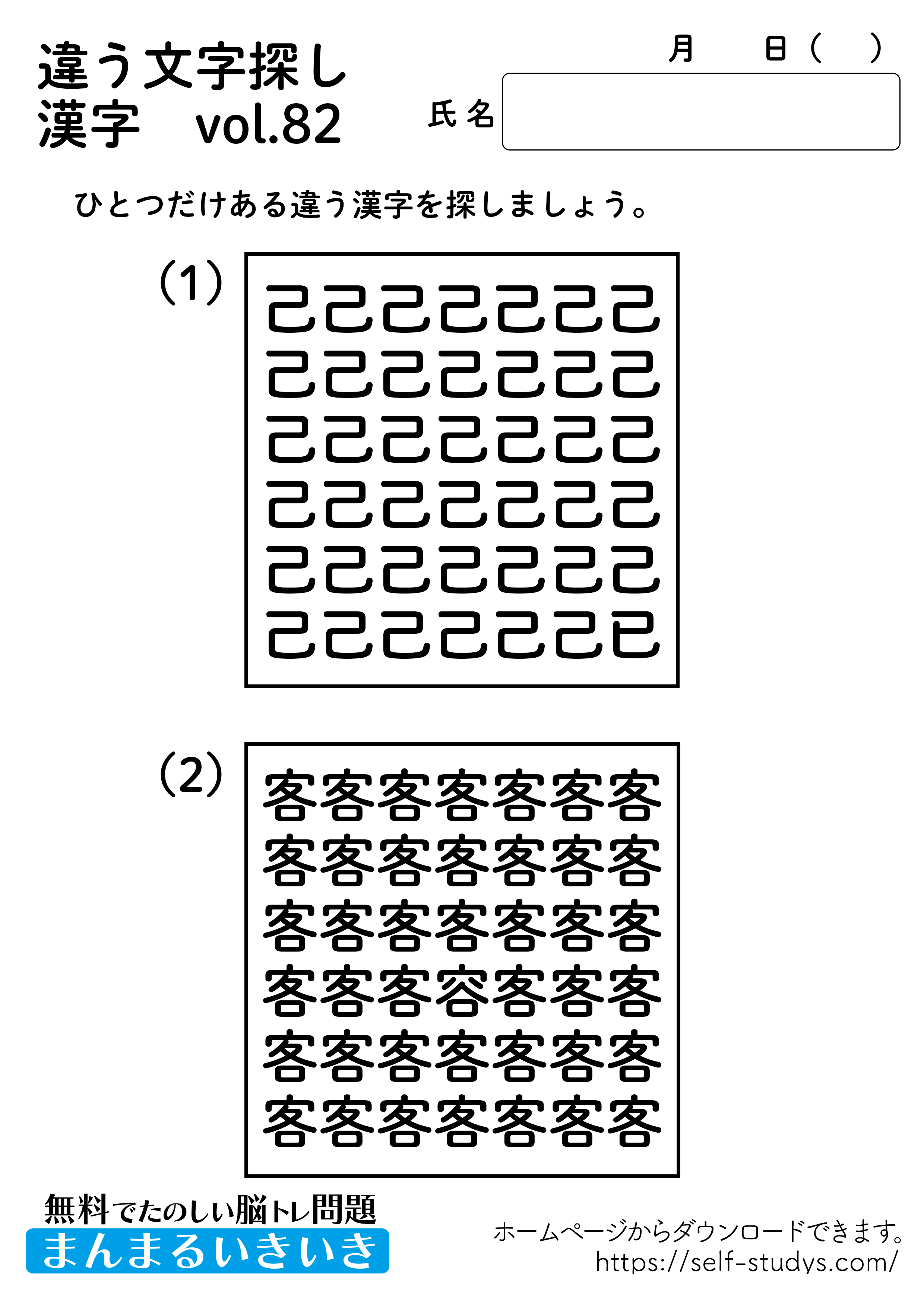 違う文字探し漢字82 2022.08.22 違う文字探し漢字82問題はすべて無料で使えます。下記の画像、もしくは、【問題ダウンロード】をクリックして印刷してご利用ください。 問題ダウンロード答えダウンロード 動体視力・観察眼を鍛えるプリントです。いつまでも健康でいられるお手伝いが出来たら幸せです。