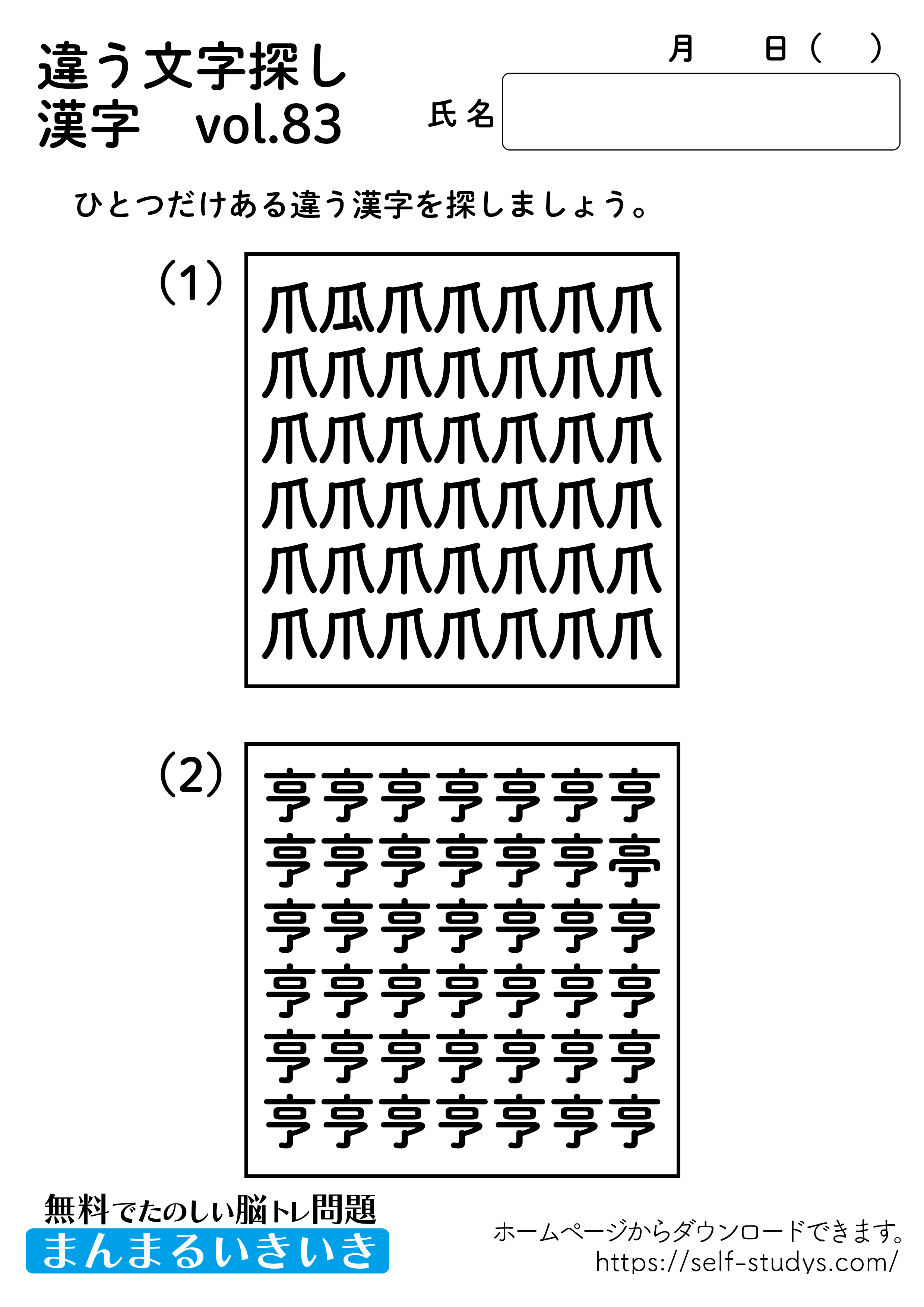 違う文字探し漢字83 2022.08.22 違う文字探し漢字83問題はすべて無料で使えます。下記の画像、もしくは、【問題ダウンロード】をクリックして印刷してご利用ください。 問題ダウンロード答えダウンロード 動体視力・観察眼を鍛えるプリントです。いつまでも健康でいられるお手伝いが出来たら幸せです。
