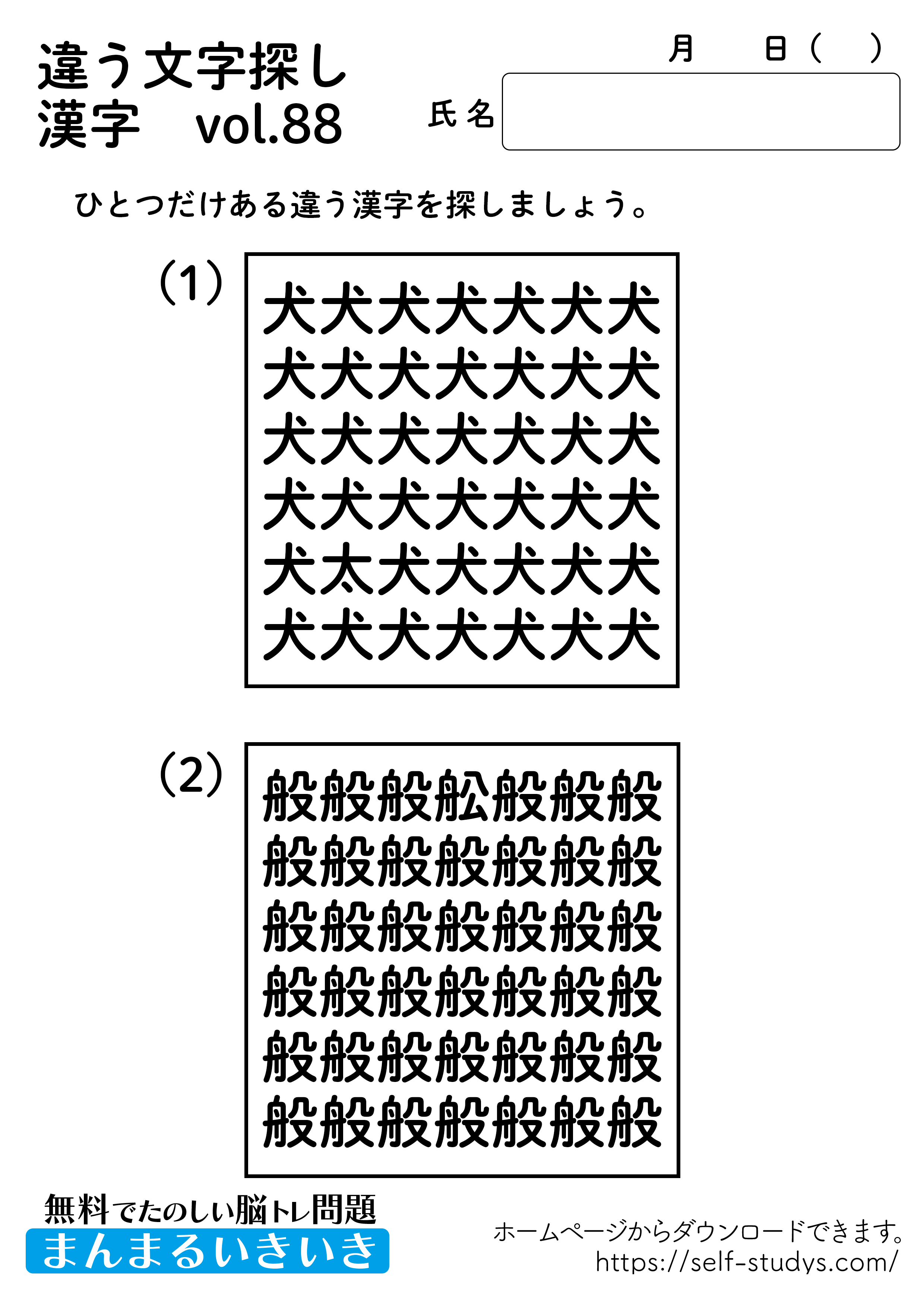 違う文字探し漢字88 2022.08.22 違う文字探し漢字88問題はすべて無料で使えます。下記の画像、もしくは、【問題ダウンロード】をクリックして印刷してご利用ください。 問題ダウンロード答えダウンロード 動体視力・観察眼を鍛えるプリントです。いつまでも健康でいられるお手伝いが出来たら幸せです。