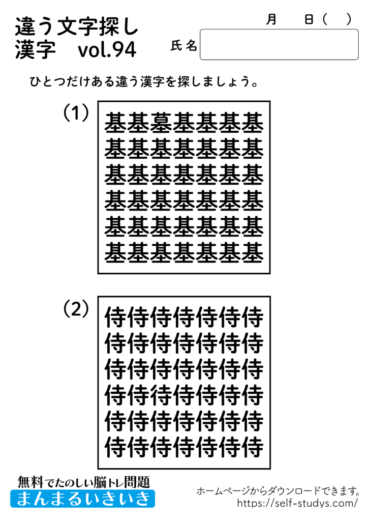 違う文字探し漢字94 2022.08.22 違う文字探し漢字94問題はすべて無料で使えます。下記の画像、もしくは、【問題ダウンロード】をクリックして印刷してご利用ください。 問題ダウンロード答えダウンロード 動体視力・観察眼を鍛えるプリントです。いつまでも健康でいられるお手伝いが出来たら幸せです。