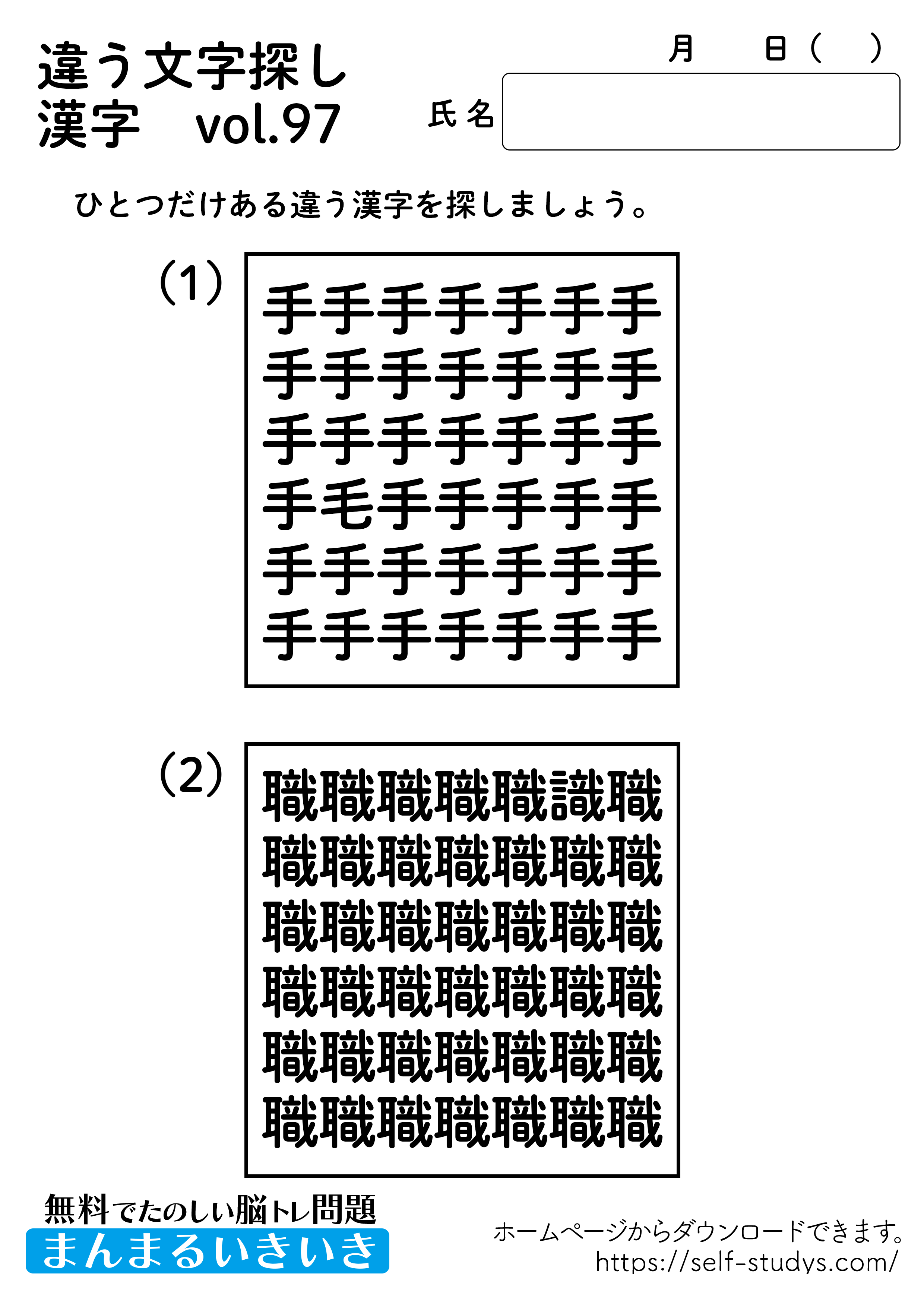 違う文字探し漢字97 2022.08.22 違う文字探し漢字97問題はすべて無料で使えます。下記の画像、もしくは、【問題ダウンロード】をクリックして印刷してご利用ください。 問題ダウンロード答えダウンロード 動体視力・観察眼を鍛えるプリントです。いつまでも健康でいられるお手伝いが出来たら幸せです。