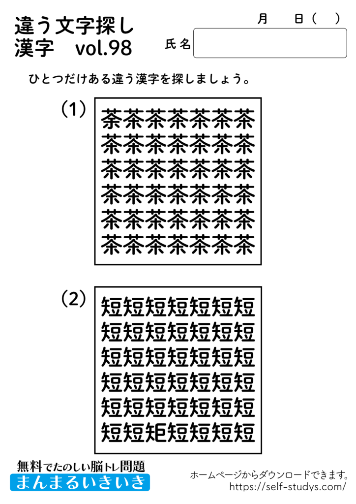 違う文字探し漢字98 2022.08.22 違う文字探し漢字98問題はすべて無料で使えます。下記の画像、もしくは、【問題ダウンロード】をクリックして印刷してご利用ください。 問題ダウンロード答えダウンロード 動体視力・観察眼を鍛えるプリントです。いつまでも健康でいられるお手伝いが出来たら幸せです。