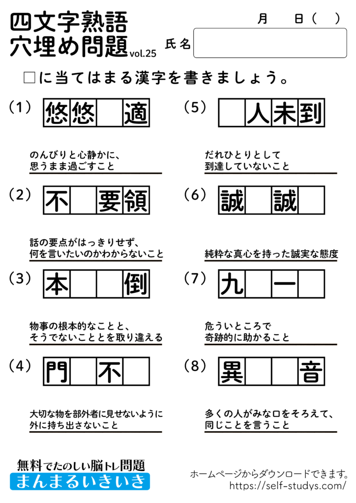 ヒントとして四文字熟語の意味を載せてあります。